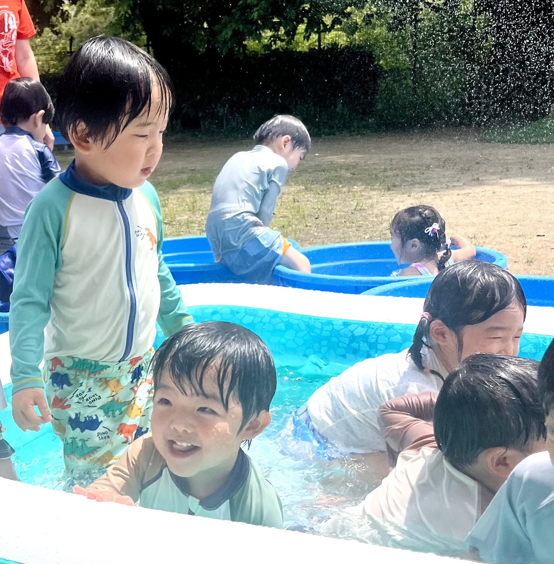 年長は年中の砂場の後半部分を継承。そのため、水は氾濫して園庭にまで流れ込むほどに。幼稚園最後の夏の年長にとっては、最高の?コンディション?の砂場・園庭となりました。これまで夏の遊びを何回も経験してきた年長ならでは。自分の好きな夏の遊びを楽しむ姿がありました。