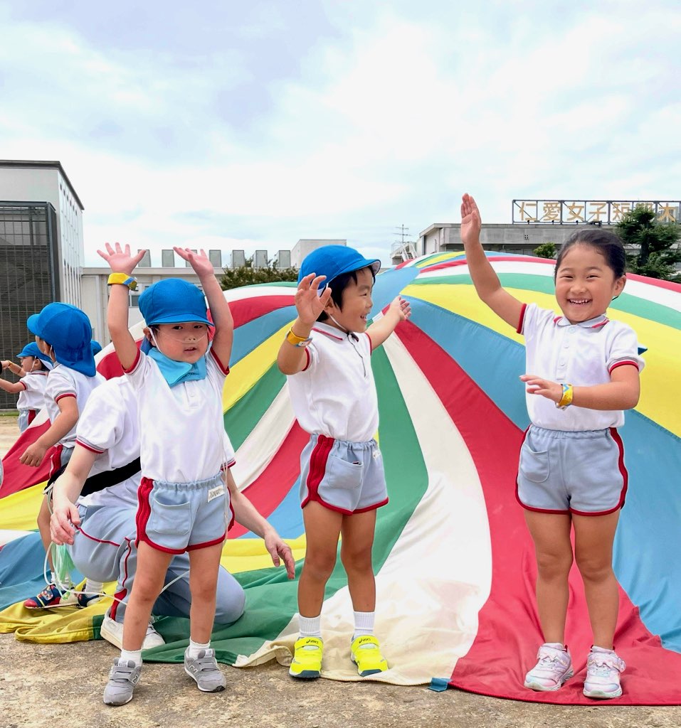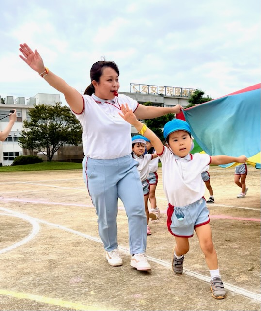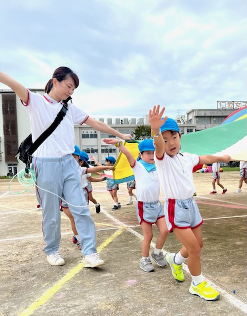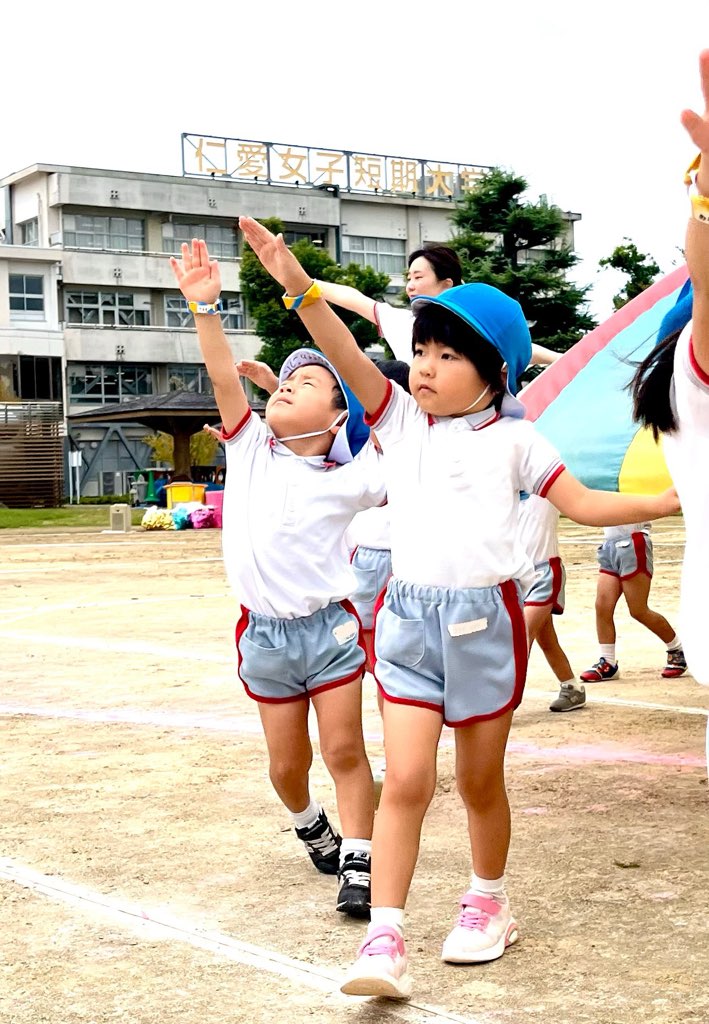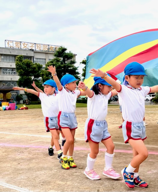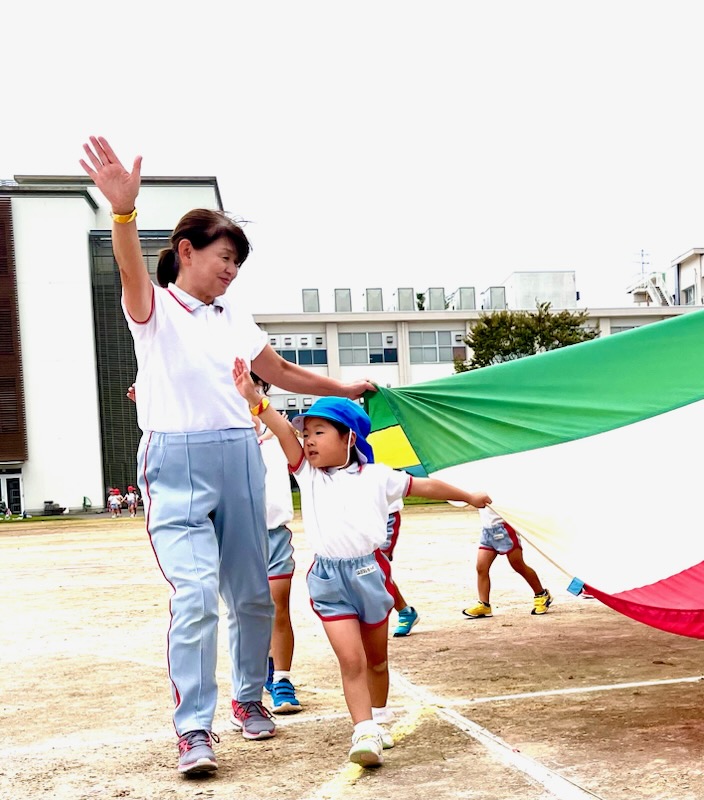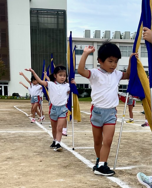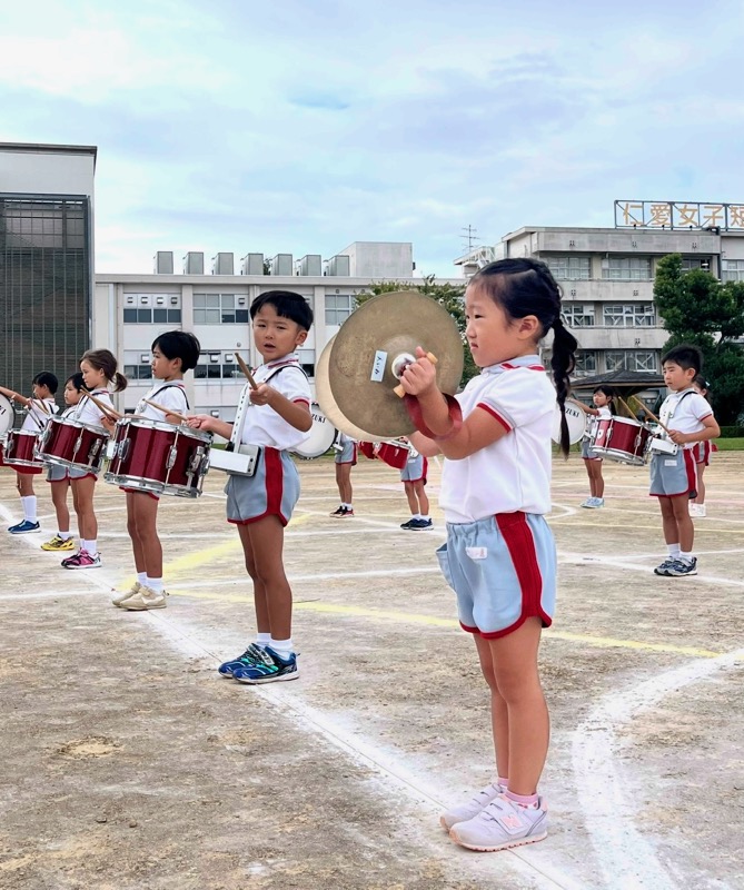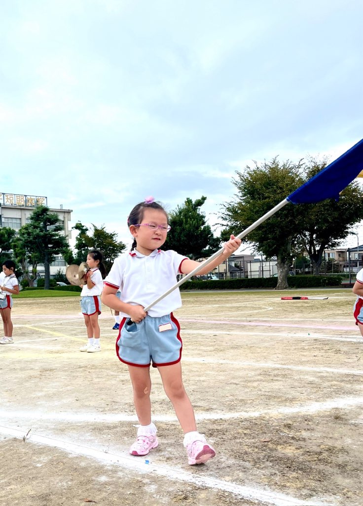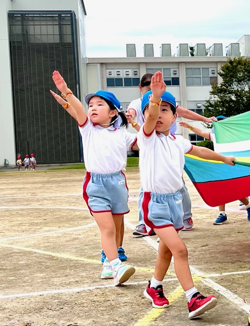 この日の短大グラウンドはバルーンには不利な風。本番も風を想定して、飛ばされないようにしっかりとつかんでの試技でした。年少の時からずっとあこがれの年中バルーンです。「かっこいいでしょう!!」そんな気持ちがビシビシ伝わってきました。