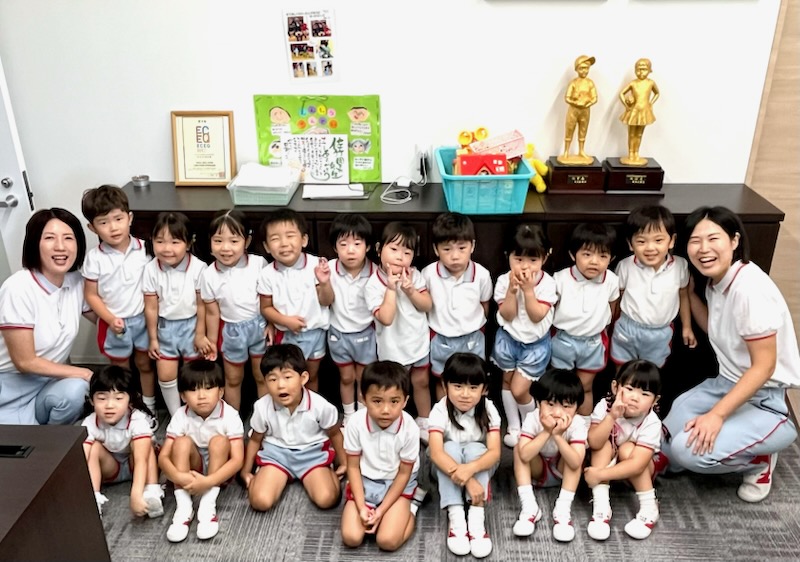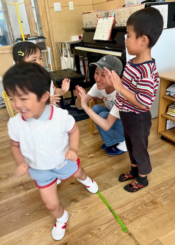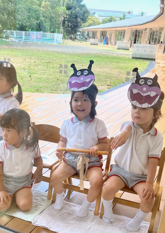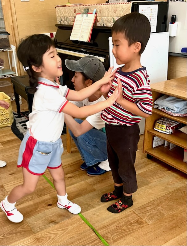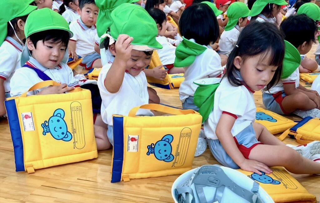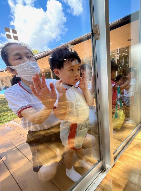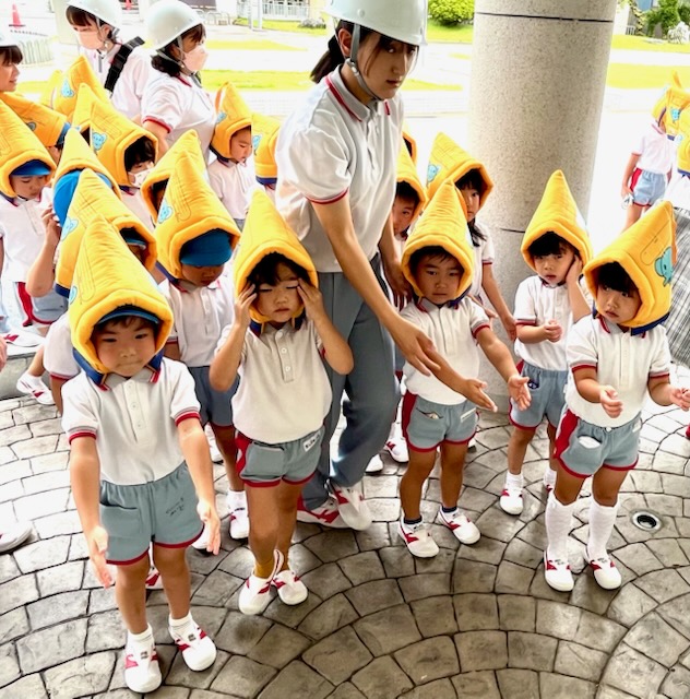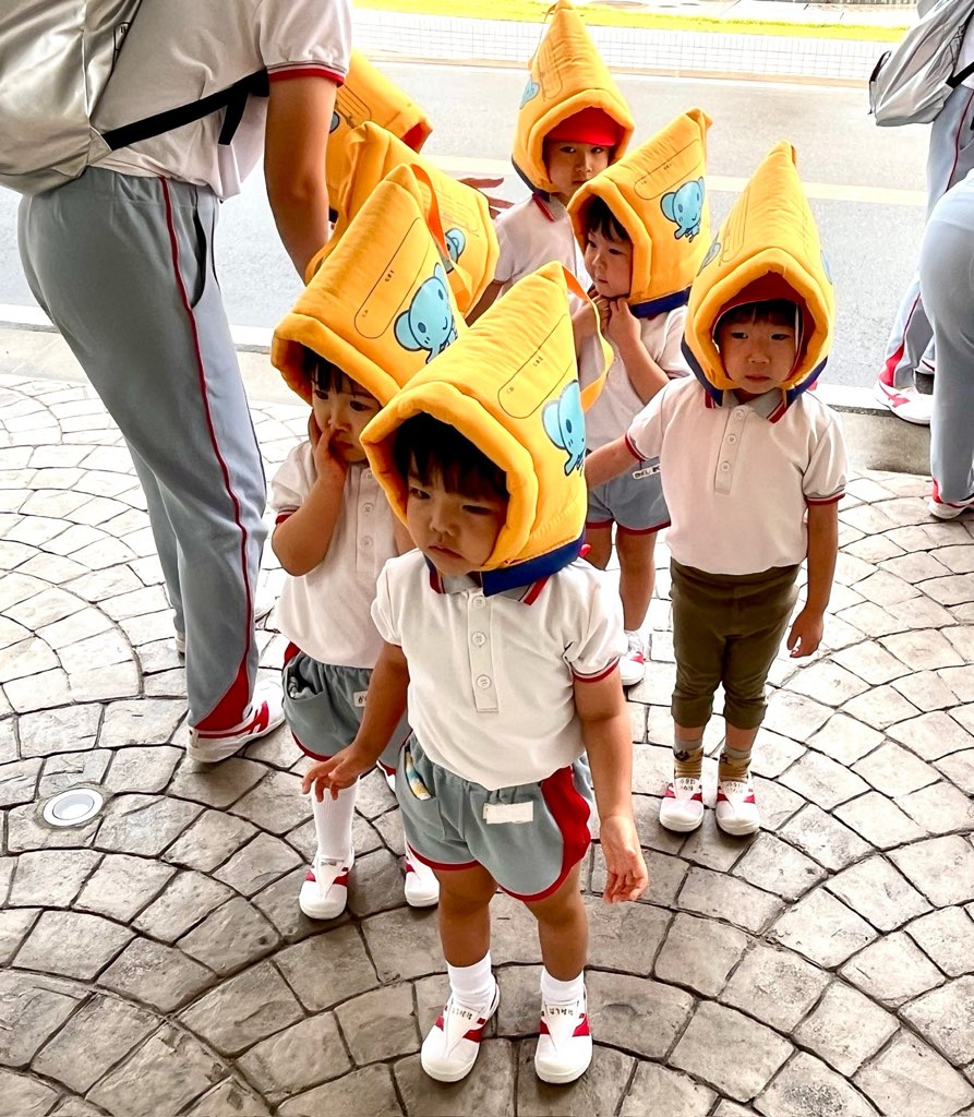 地震から火事を想定した避難訓練を行いました。年幼児は黄色い防災頭巾が嬉しくて仕方のない様子。揃って歩く様子は、おとぎの国の小人たちのようでした。また、10月1日からは年少クラスに新しいお友達が入るのに伴い、前日にお母さまと見学にみえました。クラスのみんなが元気な声で迎えて、帰りには「明日からいっしょにあそぼうね。」と全員がタッチで挨拶をしました。初登園となった翌日は、全員で園舎内を案内してくれました。
