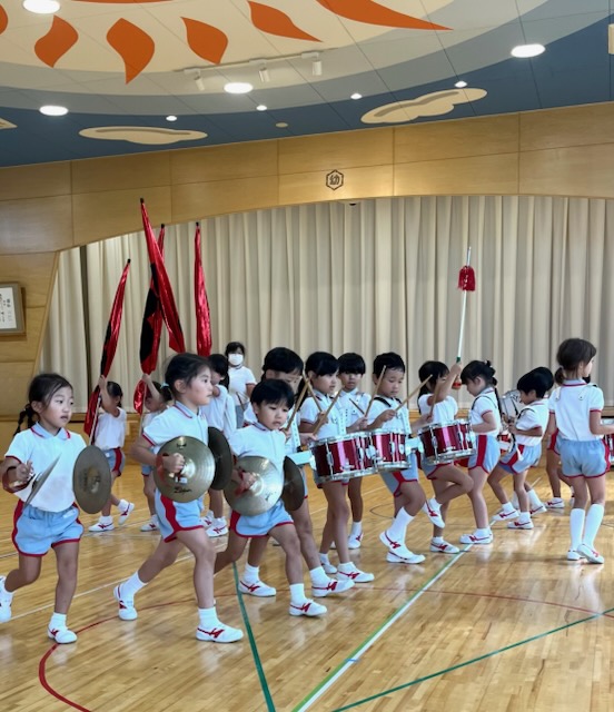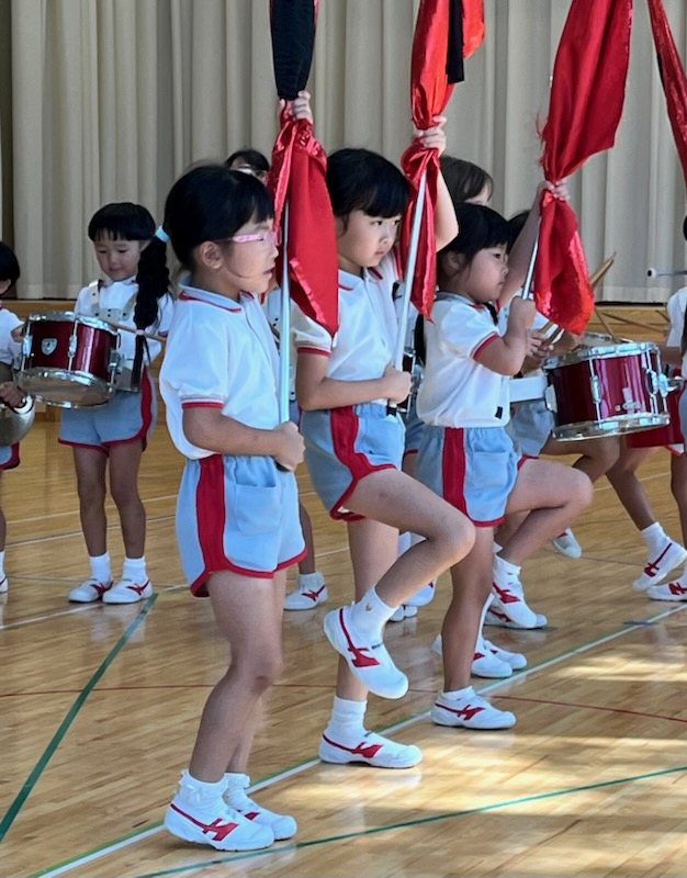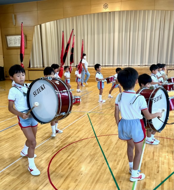運動会リハーサルが延期となった水曜日のお昼には、保育園の年長さんがマーチングを見学に来てくれました。体育館での演奏を外からしっかり見学する年幼児の姿がありました。