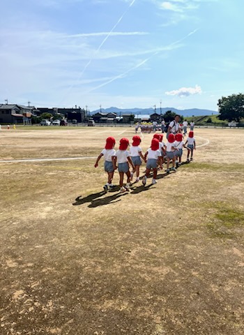 今日はリハーサル。園庭から短大グラウンドまでの移動も「運動会」です。集団での移動は、園外保育や遠足はもちろんの事、災害時の安全確保のための緊急避難時にも求められる大切な力です。短時間で一斉に園庭から短大グラウンドへの移動は、色々な目的が隠れています。