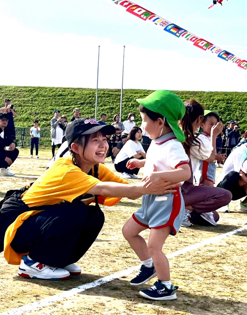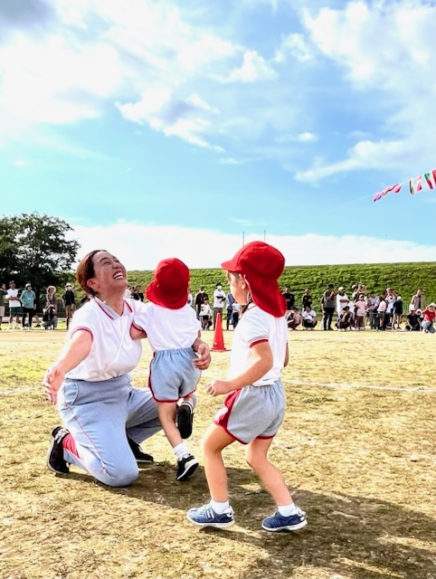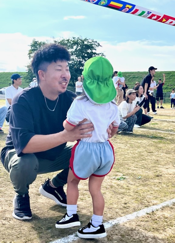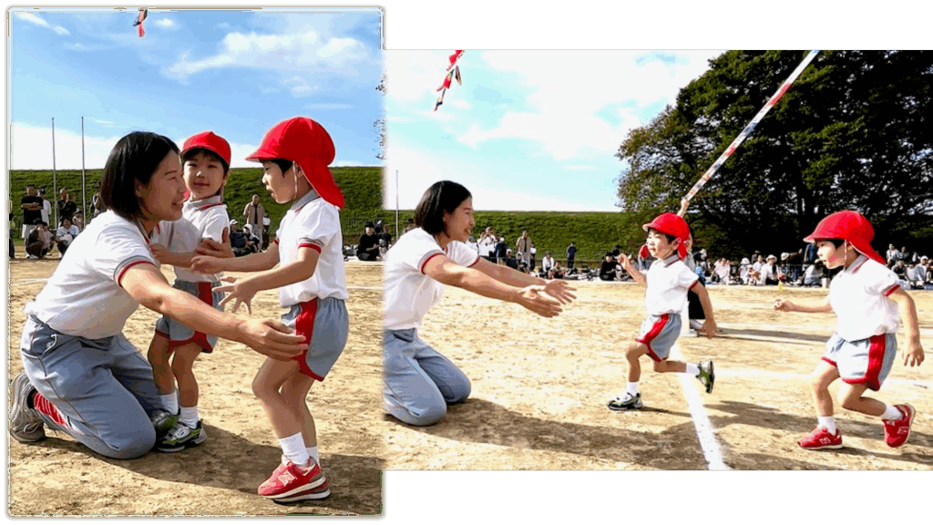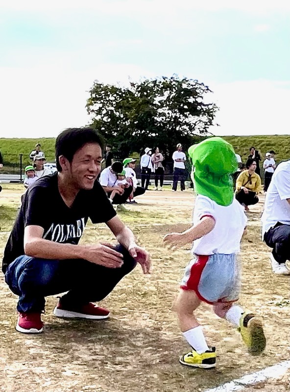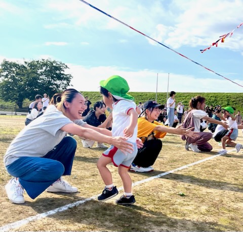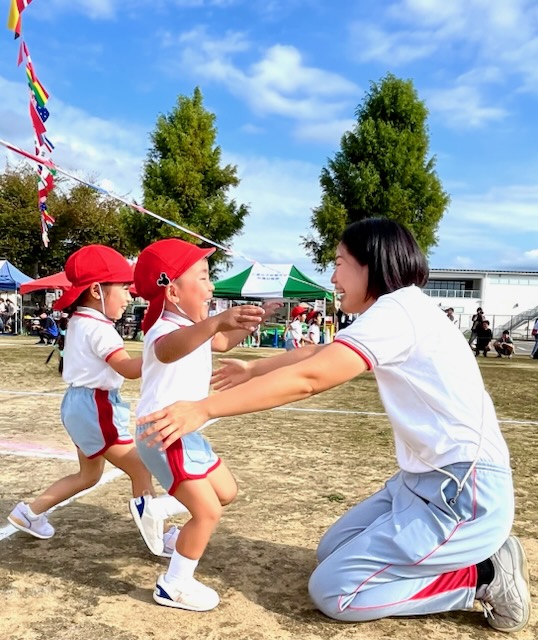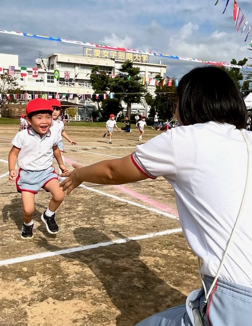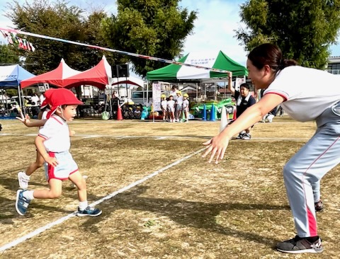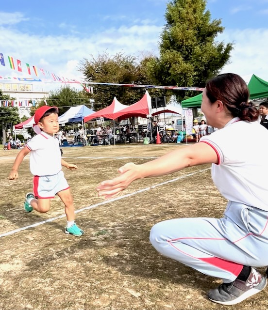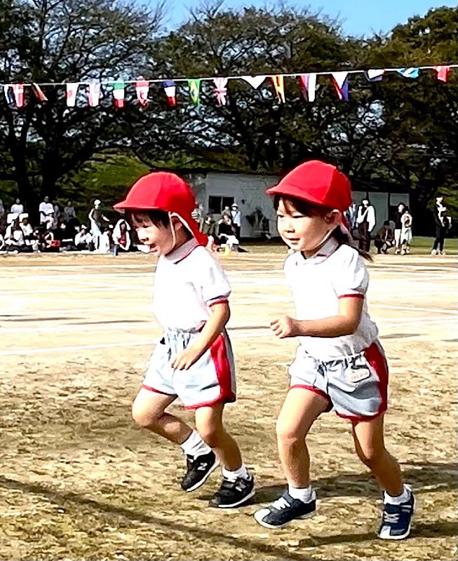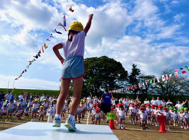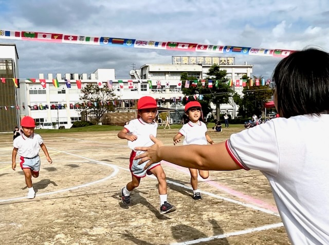 プログラムは、年幼の走り競走から始まりました。初めてのよーいドンで、おウチの方が待つゴールへ。速い遅いじゃない。これまでの育ちに目を向けていただきたい思います。そして、お子さんの来年の運動会の比較基準にしていただきたいと思います。周りの子と比べても意味がありません。グラウンドではどの親御さんも笑顔でした。年幼から年少、総じて学年がひとつ上がると身体つきもしっかりして、走り方も空中動作が長くなってきているのがわかりました。年中から年長になるとこれが顕著になっていきます。