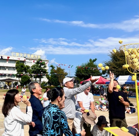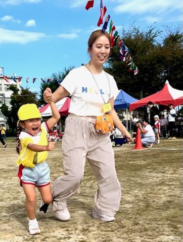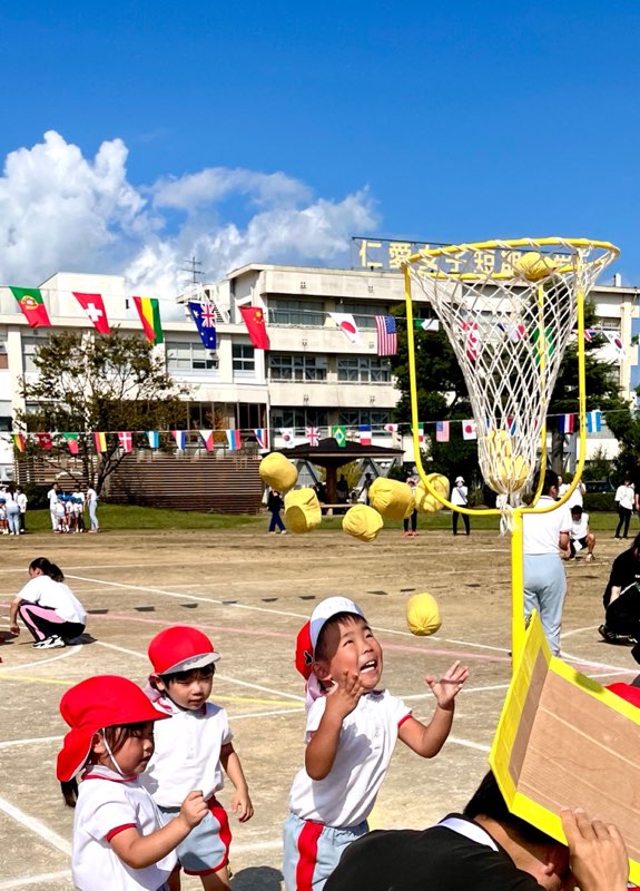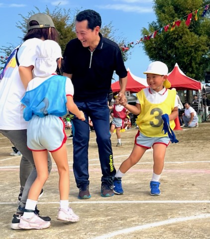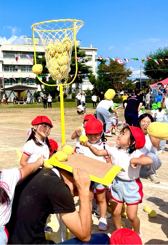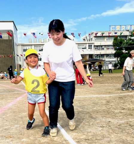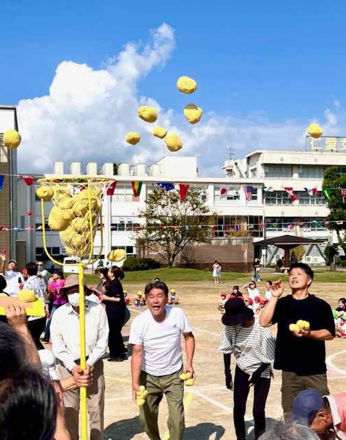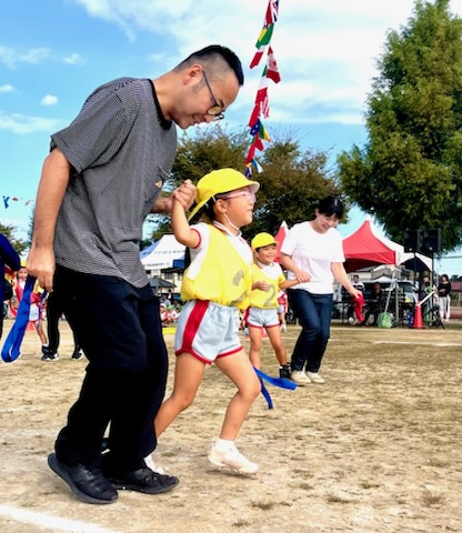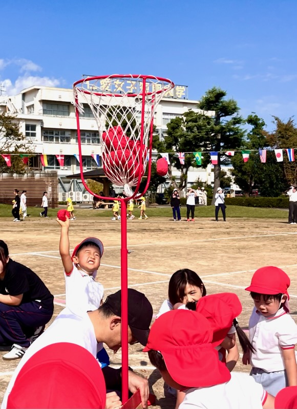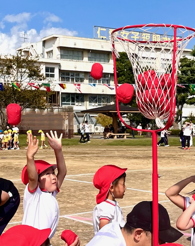 年長親子競技は二人三脚でしっぽとり。ぶっつけ本番の競技は、親子の身長と体重の差が大きい中で色々なドラマが生まれました。祖父母の玉入れでは、後日、年少のお母さんより、「父が『何年かぶりにこんなに身体を動かした。孫の為ならと思ったら、ついつい力がはいってしまって・・・。』と言ってたんですよ。」と伝えて下さいました。短時間にゴール杯が一杯になる所以です。開会式で「ここにいるみんなでたのしい運動会にしましょう。」という園長からのメッセージは確実に届いていました。