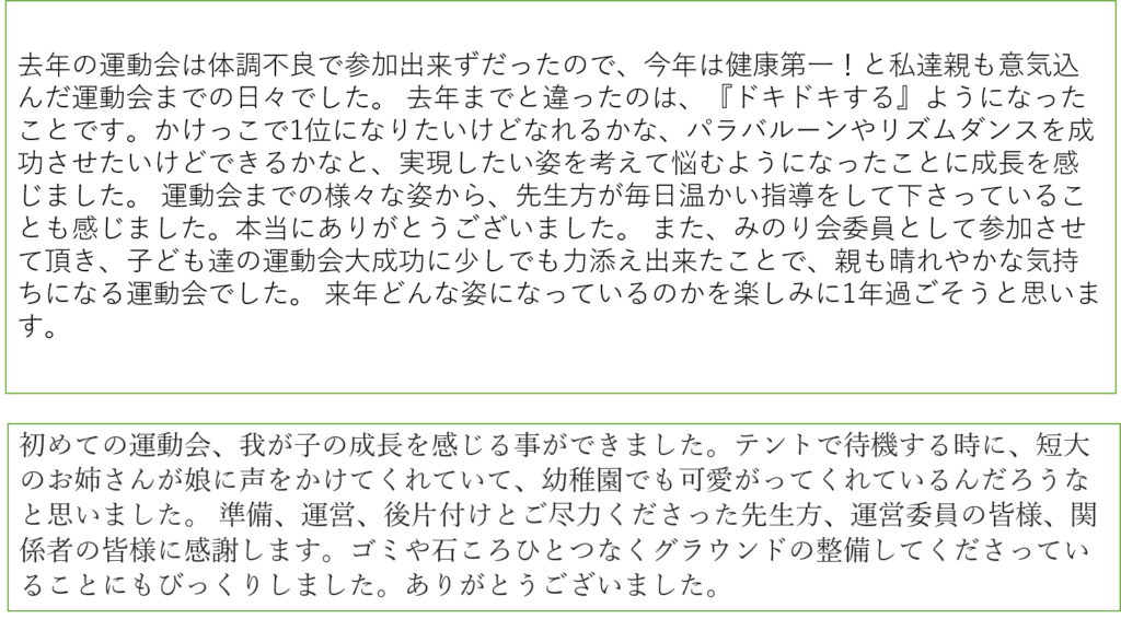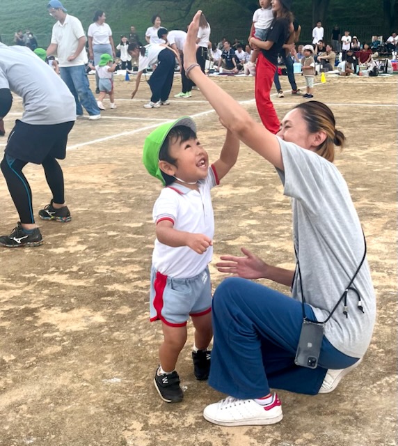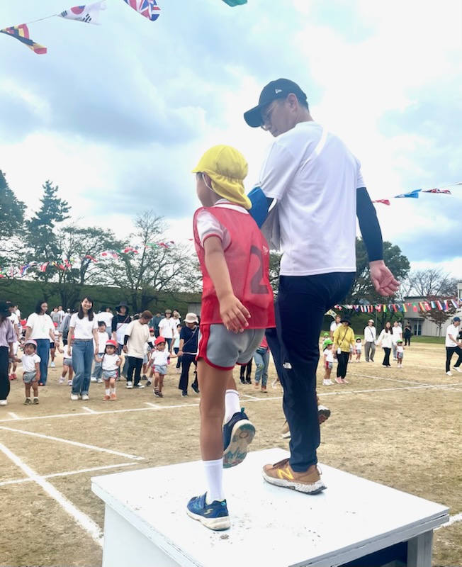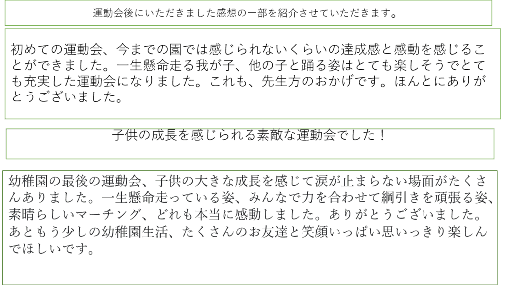 年少、年中のリズムダンス、年長のマーチングは保護者の方も毎年楽しみにしている種目です。ウロウログラウンド内に撮影に入ることも憚られます。子ども達の様子とご覧になる保護者の皆さんの様子の両方が見える位置から毎年見ています。担任の週案の反省の中にも、子ども達の真剣に取り組む姿に感激したといった表記がありました。