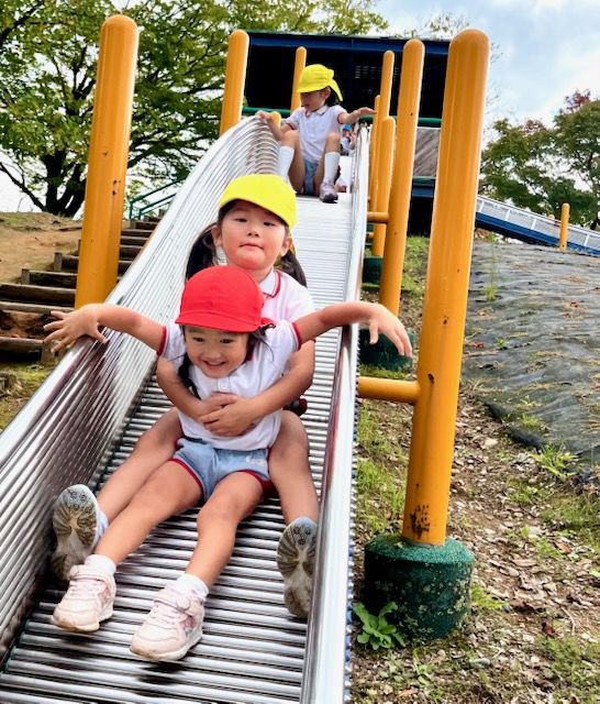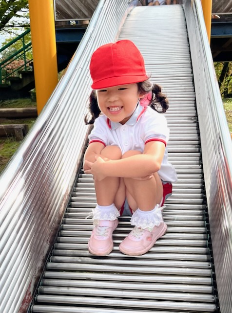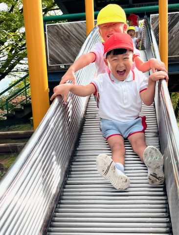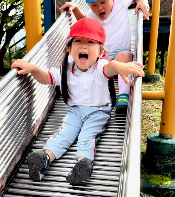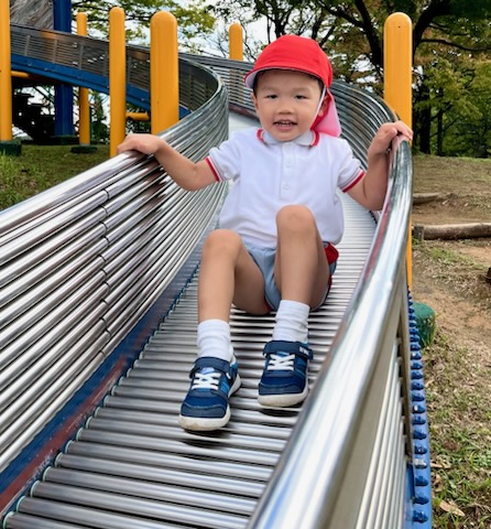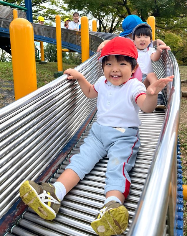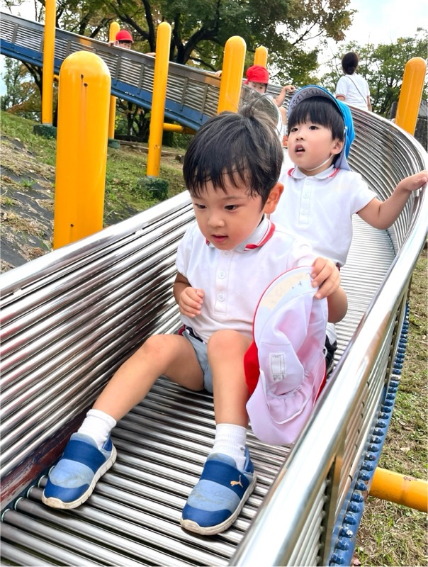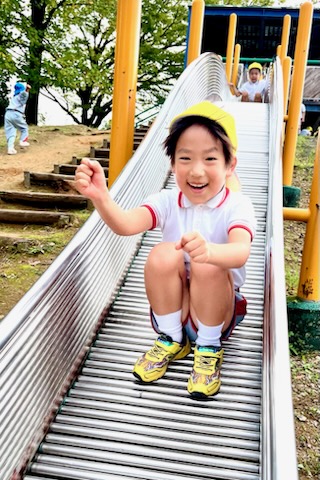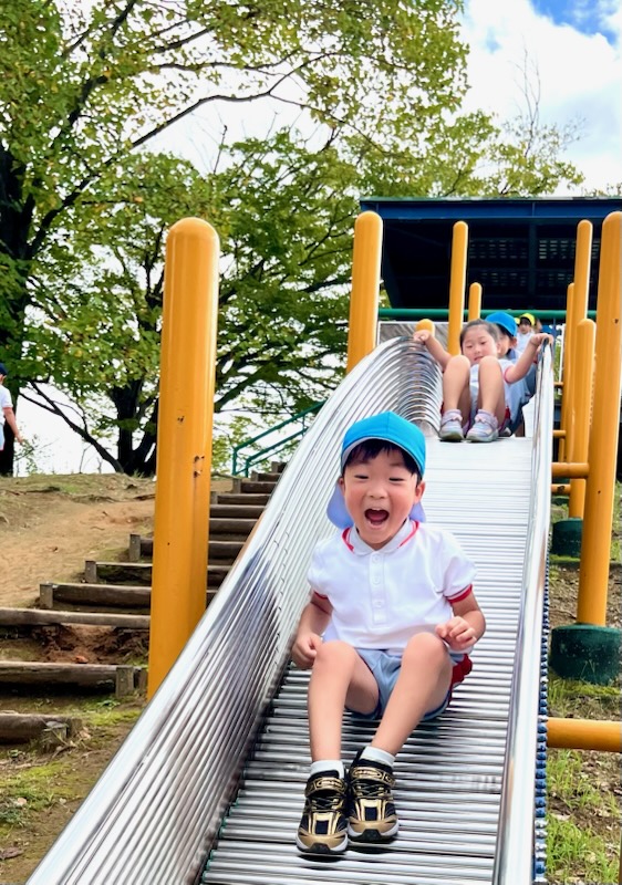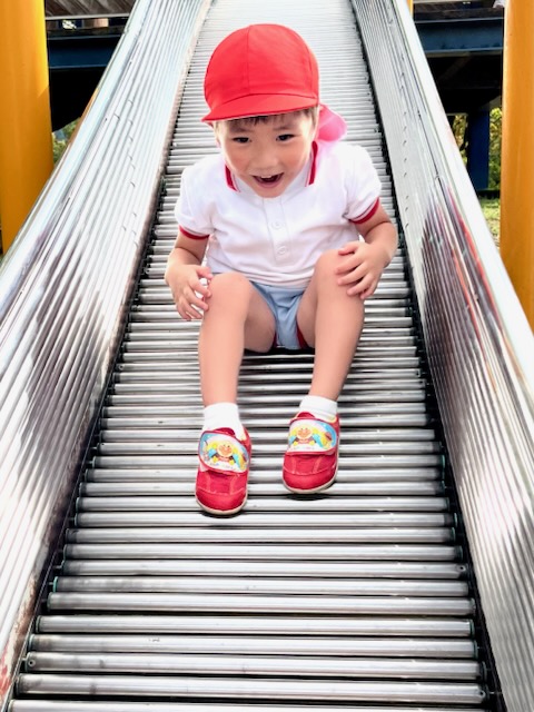 お弁当を食べた後は、午前中いけなかった遊具に挑戦。幼稚園にはない長いすべり台に多くの園児が集まりました。滑り終わっては駆け上がって次の挑戦。知らず知らずのうちに運動量が上がっていくのがわかりました。帰りの集合場所からバスまでの長い距離の整然とした移動も、運動会を前にした幼稚園と短大グラウンド間の移動が力になっていることを感じました。しかし、エネルギーは年齢相応です。帰りのバス、お迎えの時間、次々と一日分のエネルギーを消費しきった子が続出でした。たくさん遊んだ証拠でした。