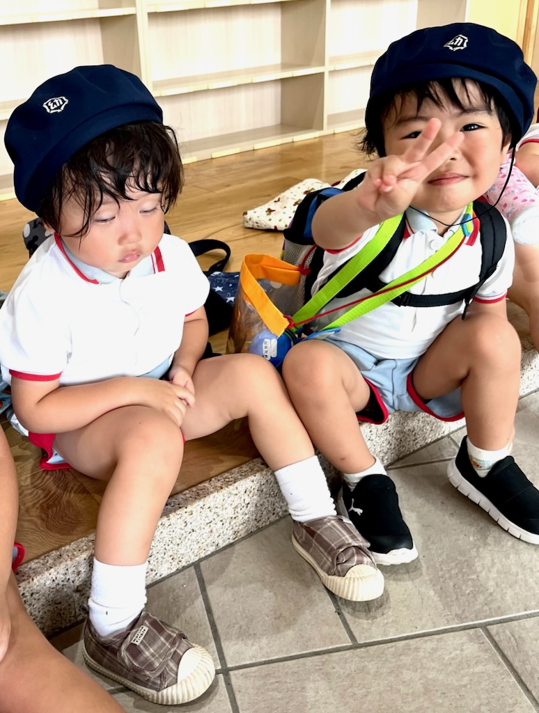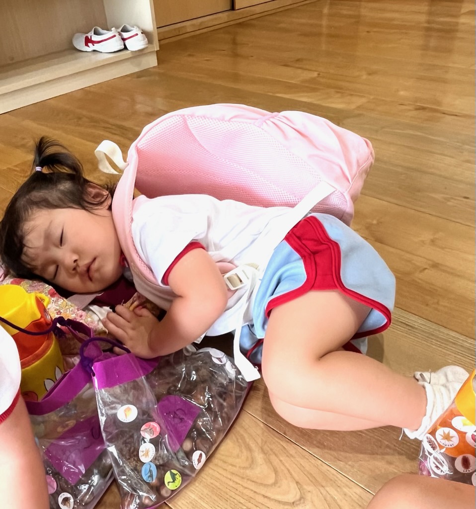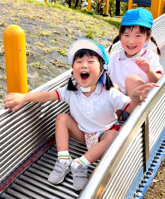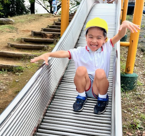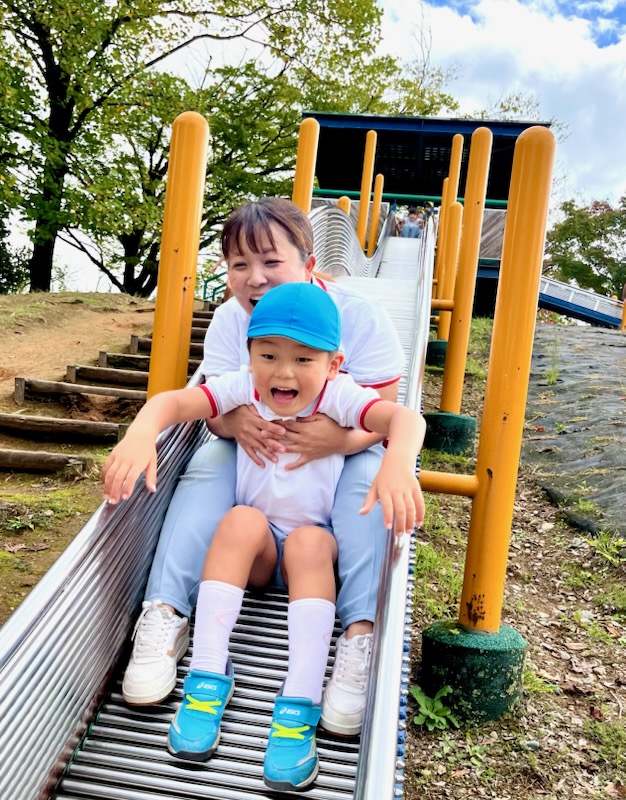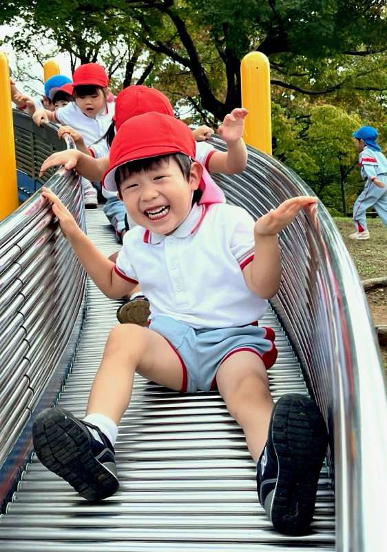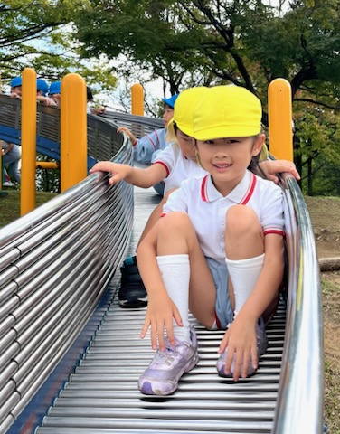 お弁当を食べた後は、午前中いけなかった遊具に挑戦。幼稚園にはない長いすべり台に多くの園児が集まりました。滑り終わっては駆け上がって次の挑戦。知らず知らずのうちに運動量が上がっていくのがわかりました。帰りの集合場所からバスまでの長い距離の整然とした移動も、運動会を前にした幼稚園と短大グラウンド間の移動が力になっていることを感じました。しかし、エネルギーは年齢相応です。帰りのバス、お迎えの時間、次々と一日分のエネルギーを消費しきった子が続出でした。たくさん遊んだ証拠でした。