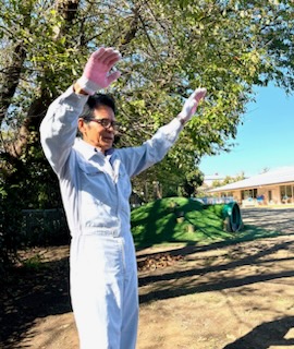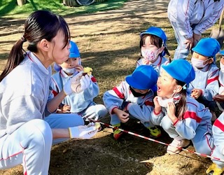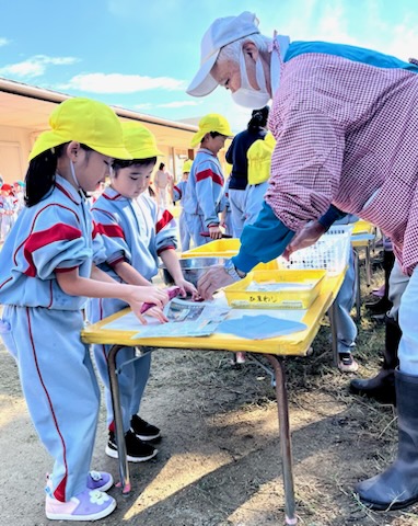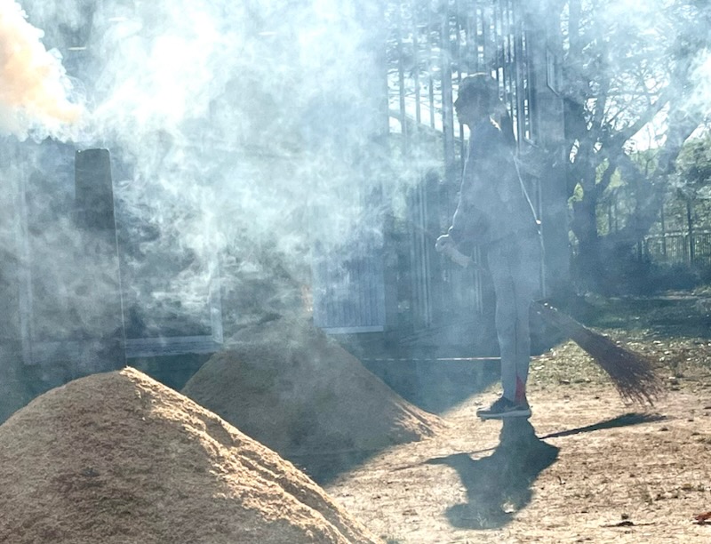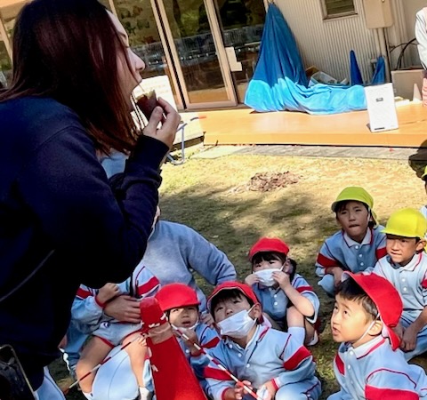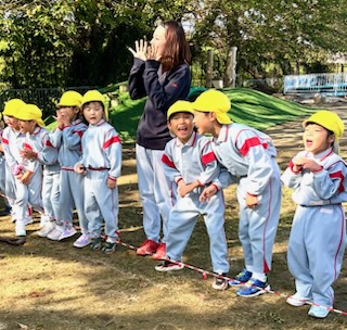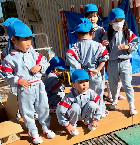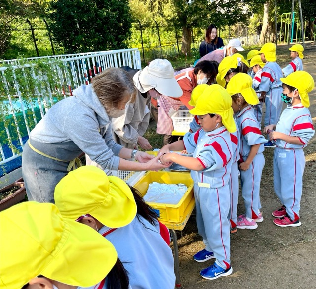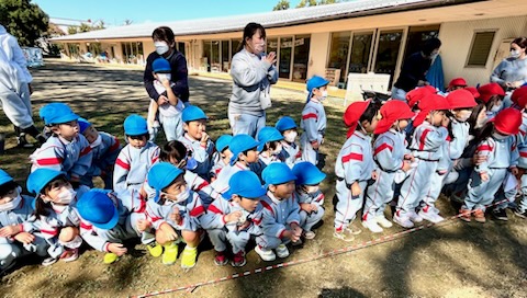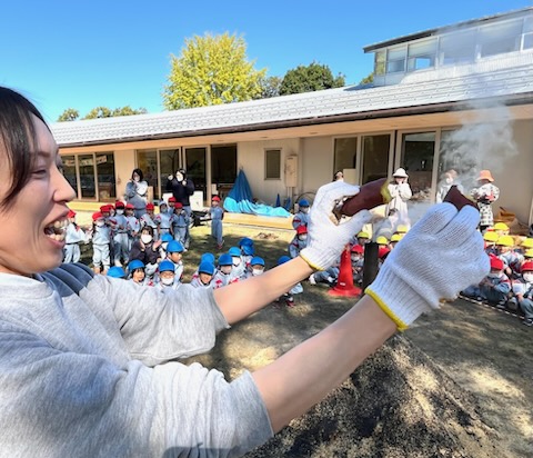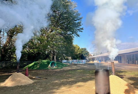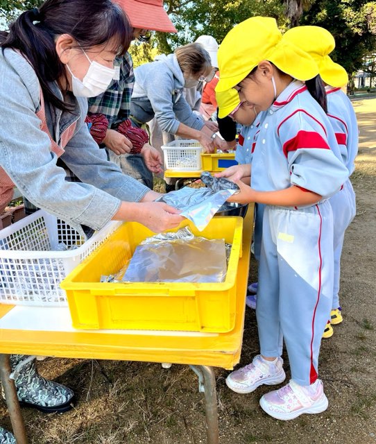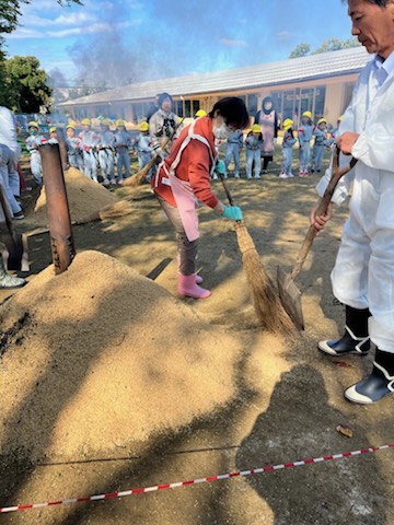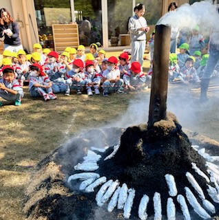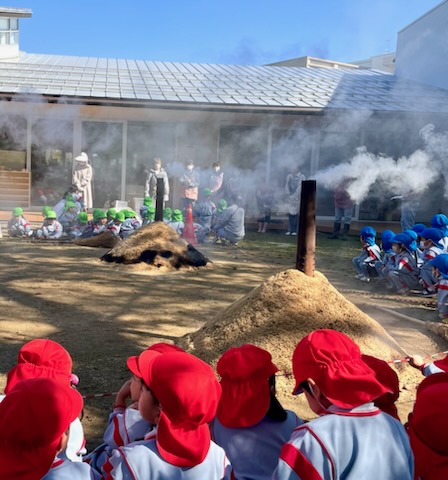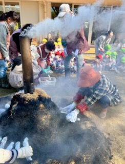 絶好のやきいも日和。もみ殻への火種作りは早朝7時より。園児が登園する時間帯にはもみ殻にしっかりと火が移り、燻炭器の煙突からは煙が立ち上がっていました。消防法で焚火も禁止された現代において、バーベキューの煙は見たことがあっても、煙で向こうが見えないほどの園庭の様子など、年幼にとっては初めての体験だったと思います。。併せて独特の煙のにおいもやきいもの思い出と一緒に、においの記憶(プルースト効果)として、身体の中にしみこんでいったことと思います。「もくもくのけむりだ~。」と登園した子どもが思わず叫んでいました。「帰ってきた子どもの全身が煙臭かった…」と笑いながら翌朝お話をして下さるお母さんがいらっしゃいました。夕方、着ていたもの全てごみの袋に入れてリュックに詰め込んで、電車に乗りました。途中、童謡『たきび』の歌が頭に浮かびました。『…垣根の垣根の曲がり角、焚火だ焚火だ落ち葉たき あ~たろうか、あたろうよ・♪』消防法で焚火が禁止となった現在。このやきいもの開催にあたっては、特別に届けを消防署に出しております。しかし、近隣に住宅が密集していれば、これだけの煙をだすような活動はできないでしょう。そう考えると、子ども達が将来、もみ殻の煙自体嗅ぐことができない社会になっていくのか・・・。そんなことを思いながら『けむり』でいっぱいのリュックを膝に抱えなおしました。