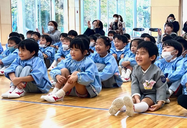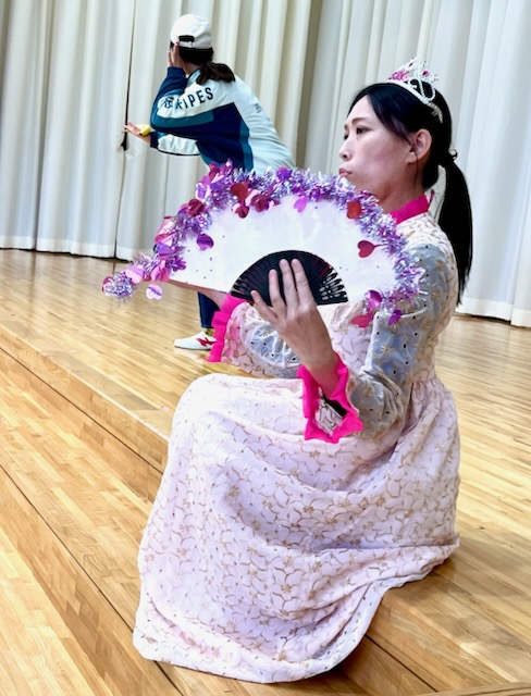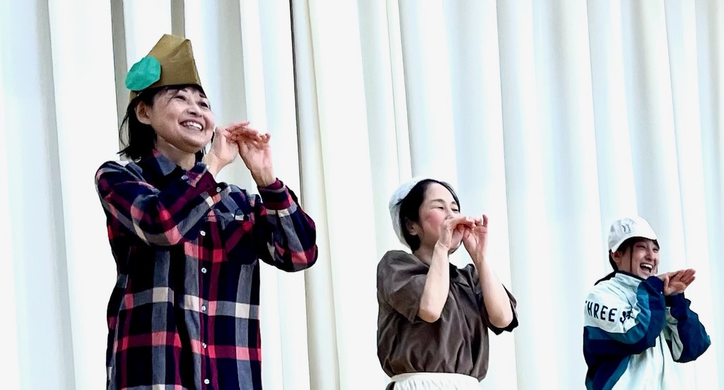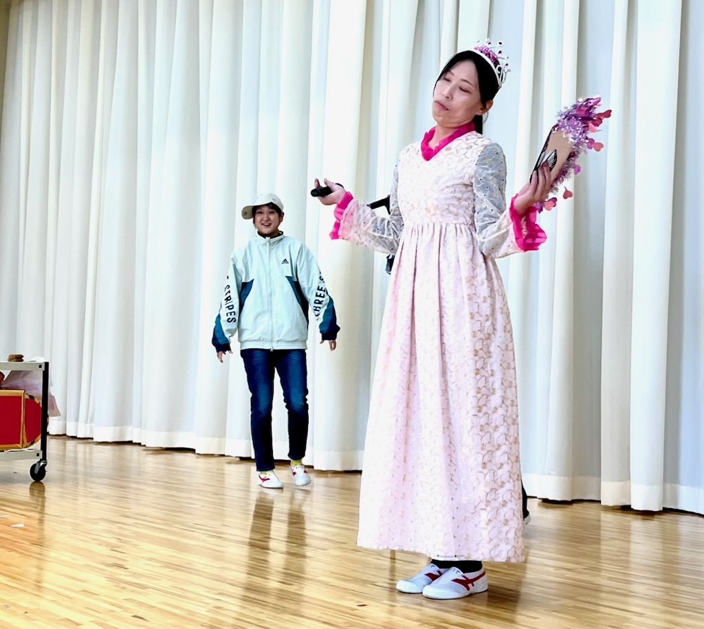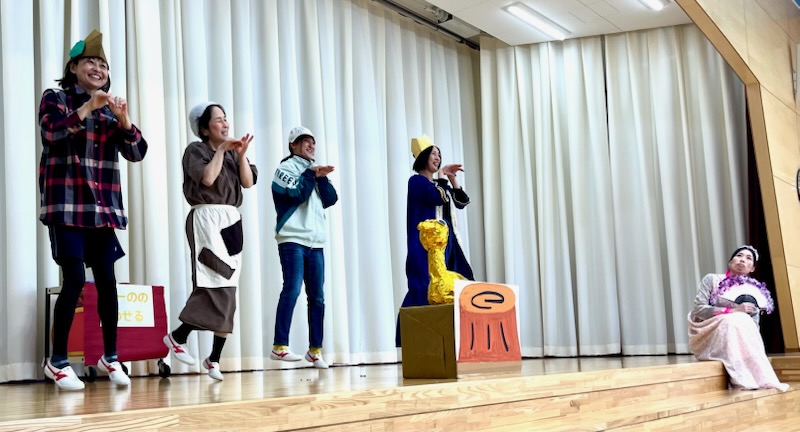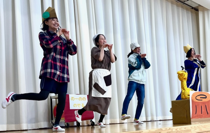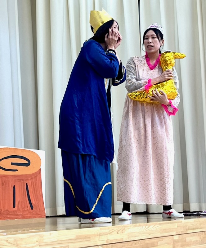 11月の誕生会の教師の出し物は、『金のガチョウ』。笑わないお姫様を何とか笑わせようとする村人たちや木こりが登場しました。どの役もまさに「はまり役」という言葉を演じきって、誕生月の子ども達をはじめ全園児を楽しませてくれました。時間にして10分足らずの劇ですが、衣装作りから舞台リハーサルを重ねて「全力」で本番に臨む姿は、まさしく子ども達を思う『じんあいようちえんのせんせい』でした。