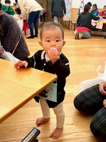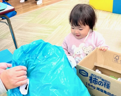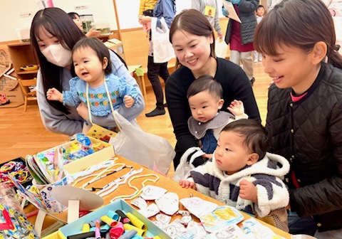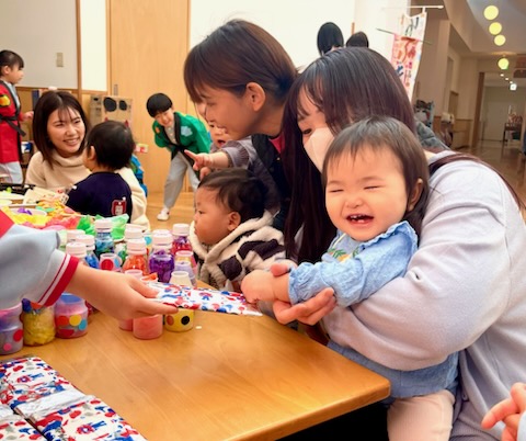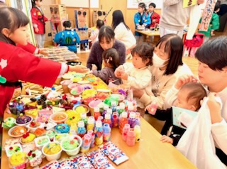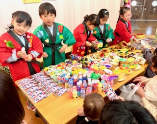 12月のちびっこクラブは、年長さんが開くお店屋さんでのお買い物を楽しみました。ちびっ子よりもお母さんの方が楽しんでる?買い物風景が随所にみられました。