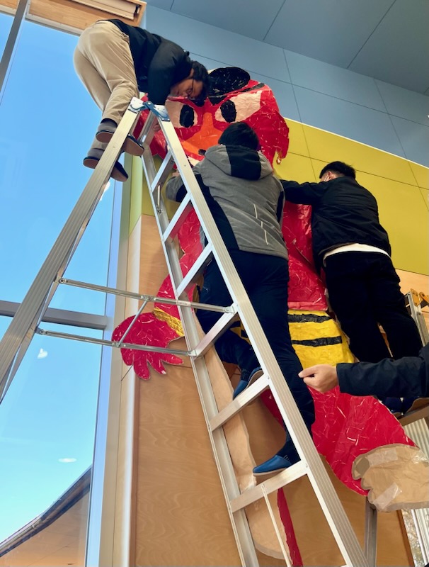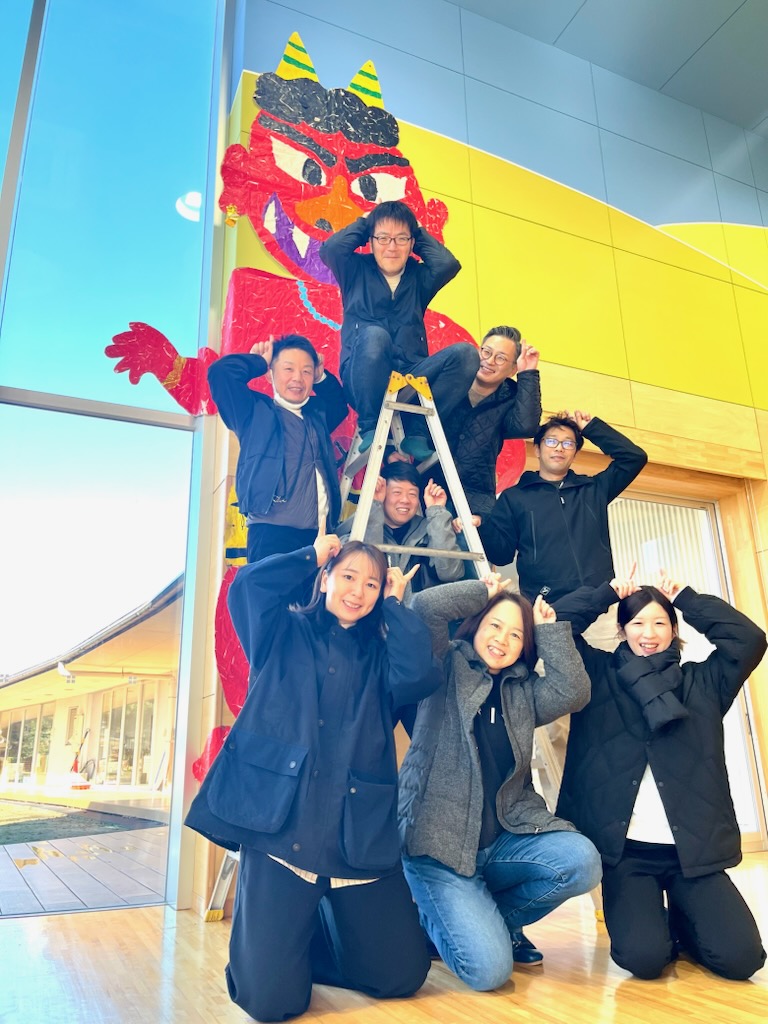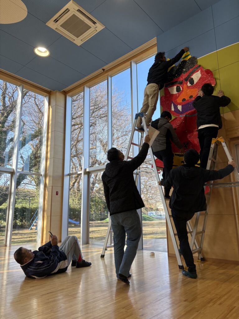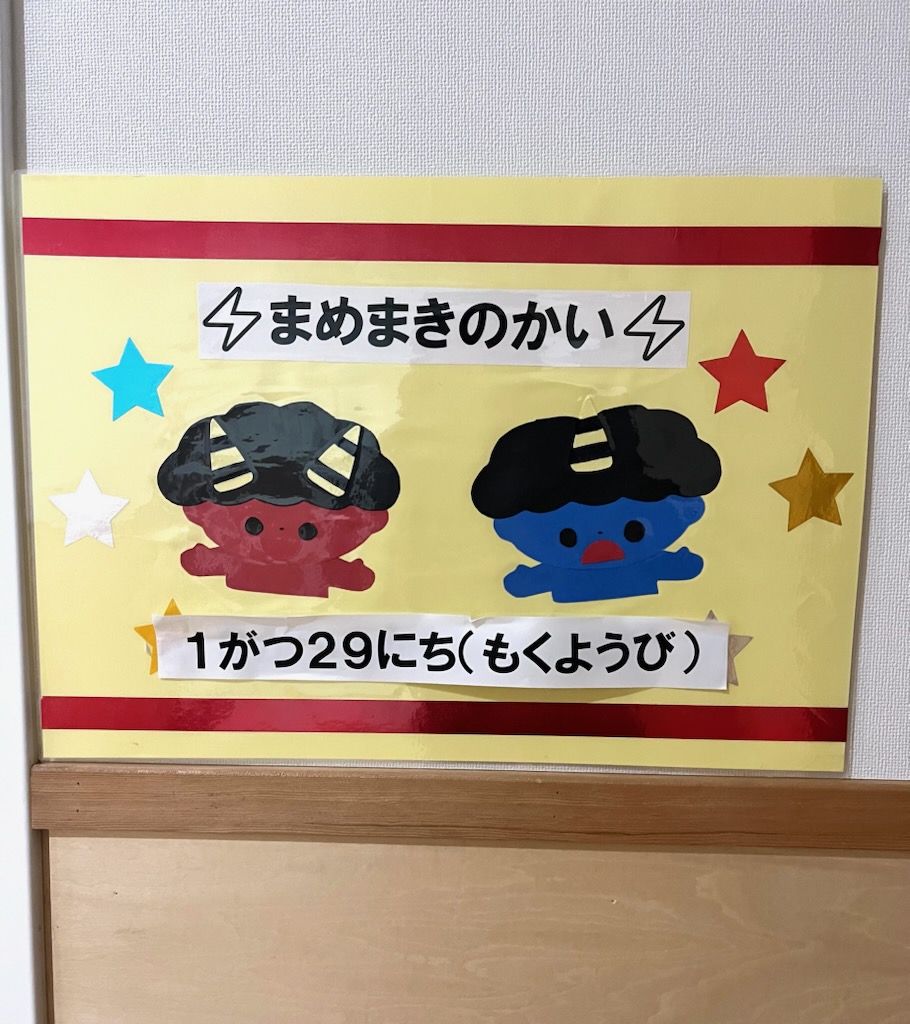 29日の豆まきの会を前に、10日(土)のみのり会運営委員会の後、運営委員さんが体育館に大鬼を出して貼ってくださいました。体育館の準備は完了です。入り口には豆まきの会のポスターが貼られています。ポスターを見ただけで、体育館に鬼がいると勘違いして泣き出す年幼児が先日でてきました。運営委員会の後、生活発表会の舞台の鉄骨やパネルも運んで準備いただきました。職員は、そのあと静かに園舎内に鬼の帽子や鬼の人形を・・・。