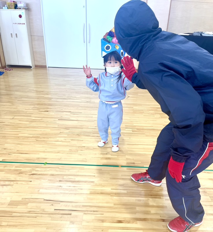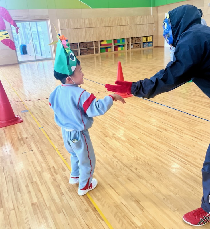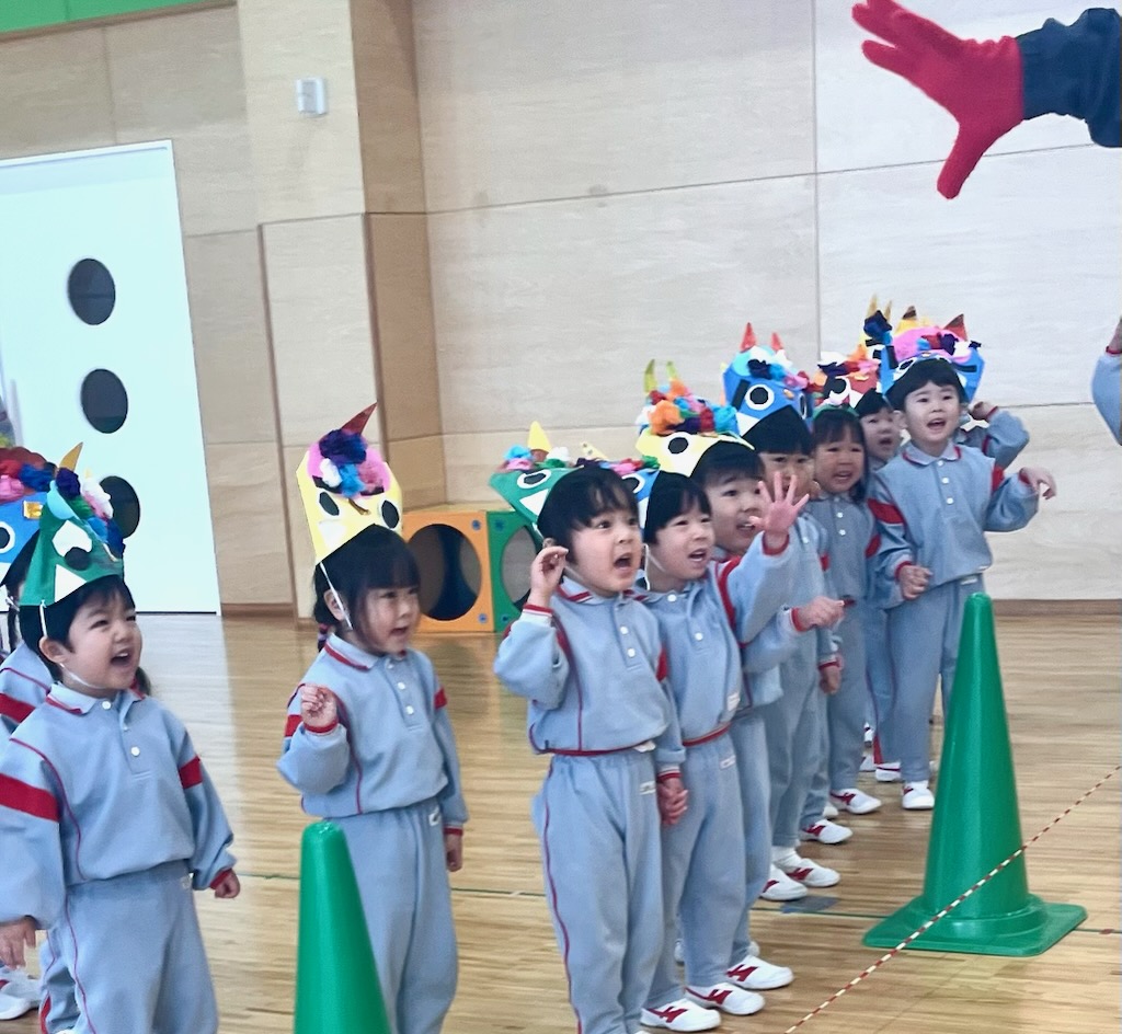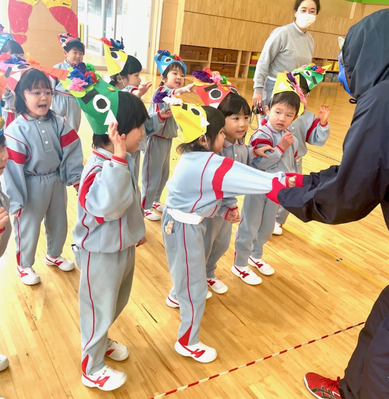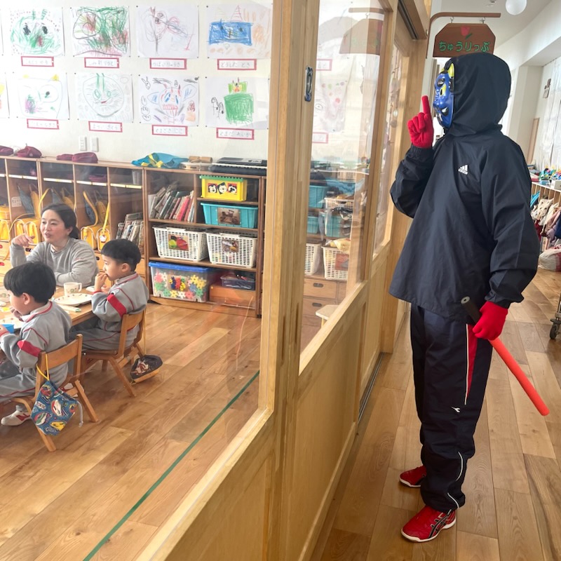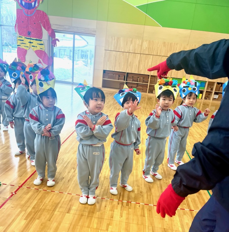 明日の豆まきを前に年少の最終確認には、鬼も前日入りしてくれました。鬼もリハです。鬼としっかり向かい合って、「おにはそと」と鬼に豆をぶつけること。決して鬼から逃げないこと。鬼は結界の赤い紐から中には入ってこない事などを確認しました。