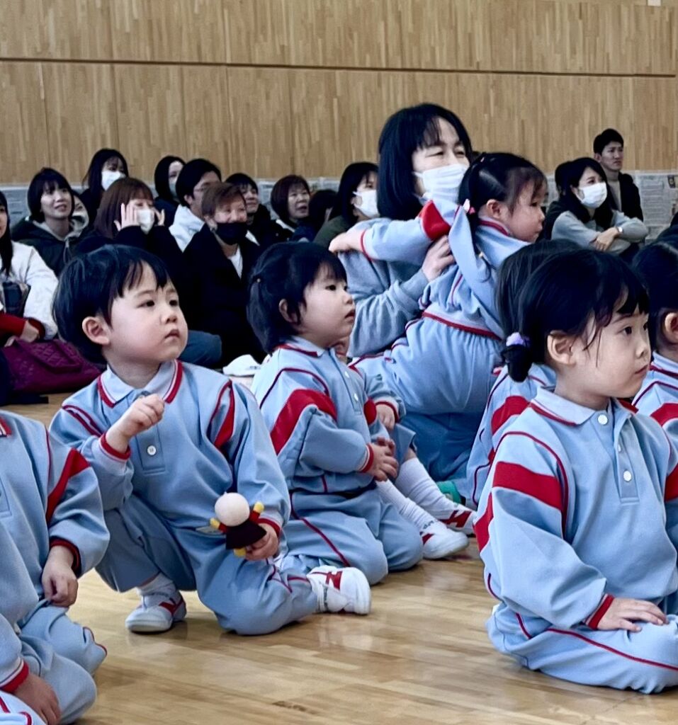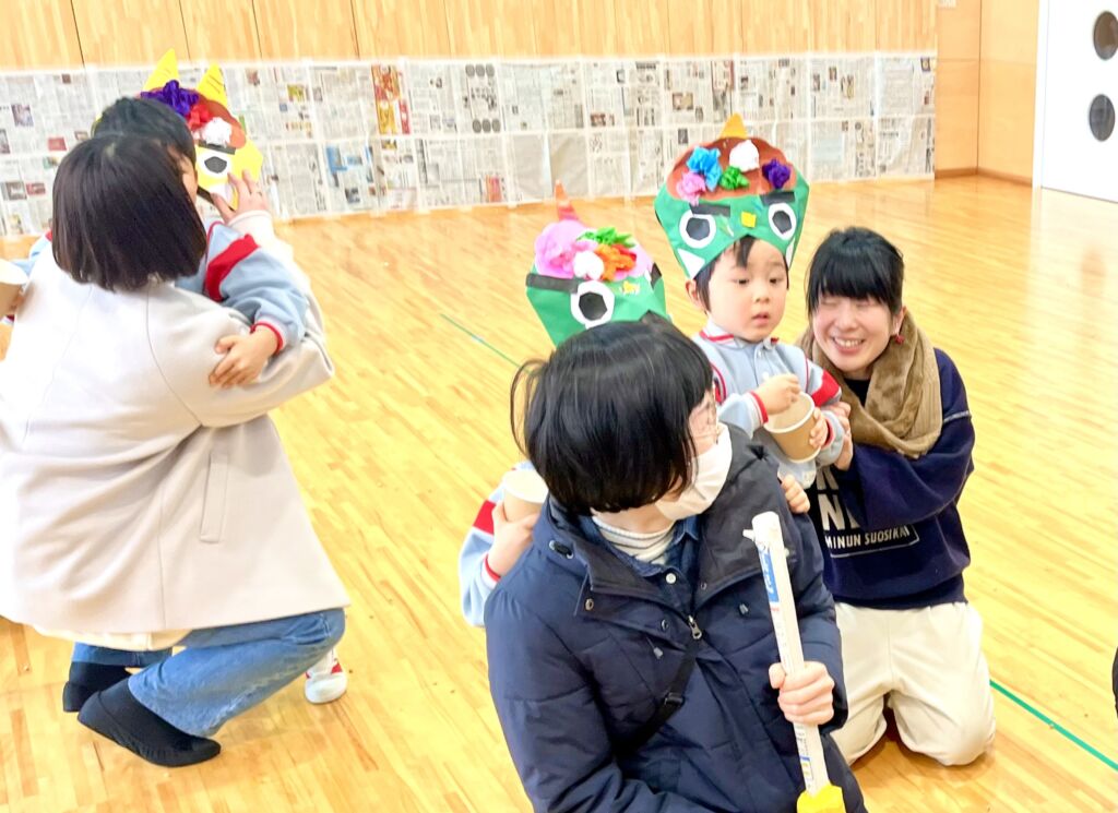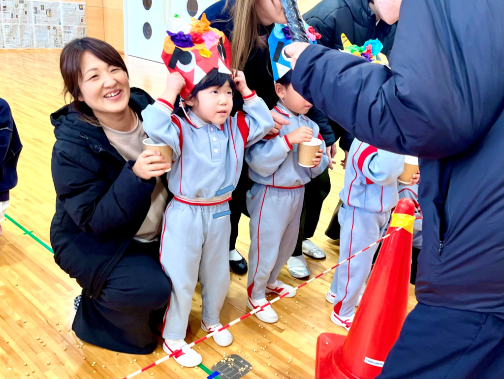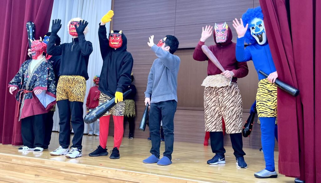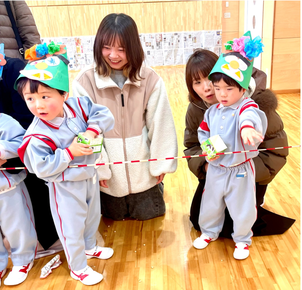 いつも傍らにいてくれる大好きな先生がステージの上に・・・。それも怖い鬼に追いかけられている。人生初の大ピンチのような豆まきのオープニングから、『鬼のパンツ』のダンスでは笑顔になって踊ることが出来ました。続く学年ごとの豆まきでは、年幼はおうちの人と一緒に力いっぱい豆をまき、年少も結界に守られ、動かない箱鬼と動かないパパ鬼たちを退治しました。
