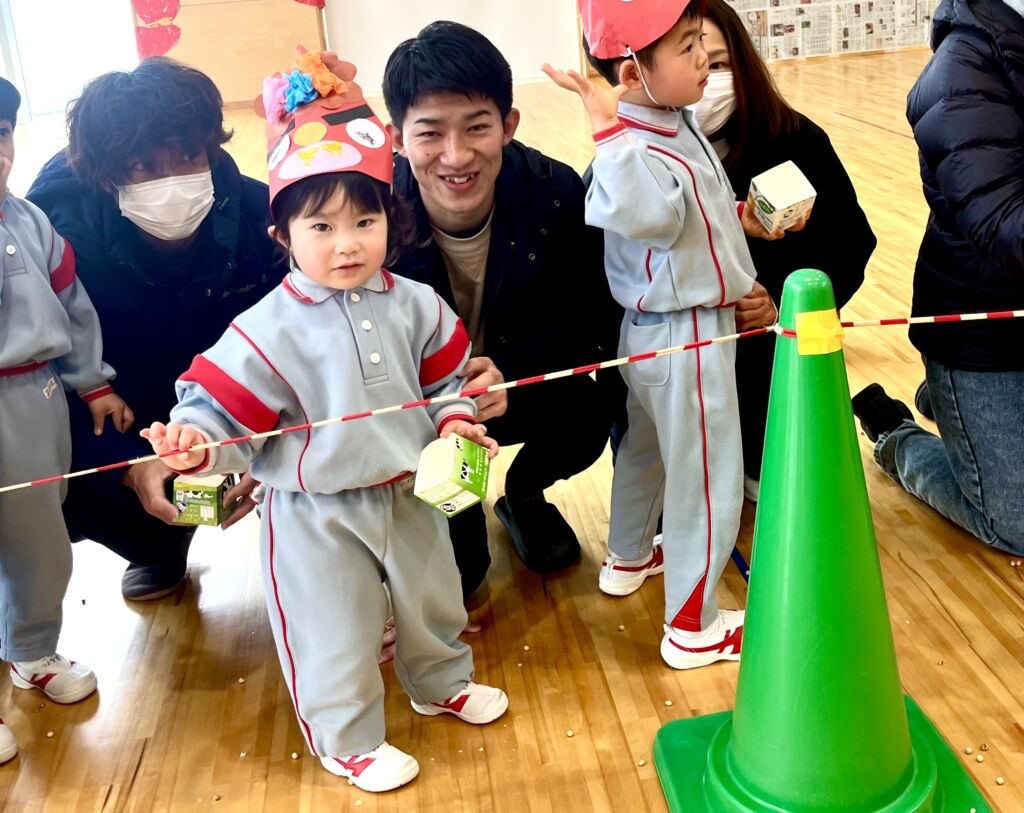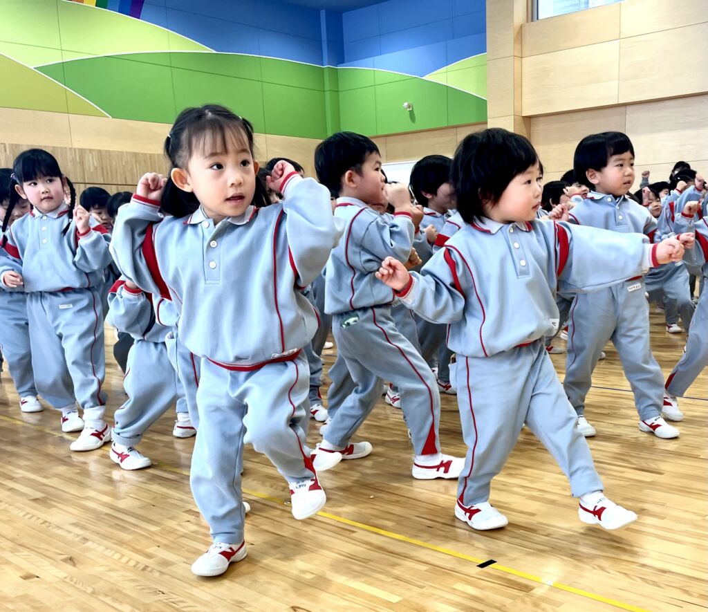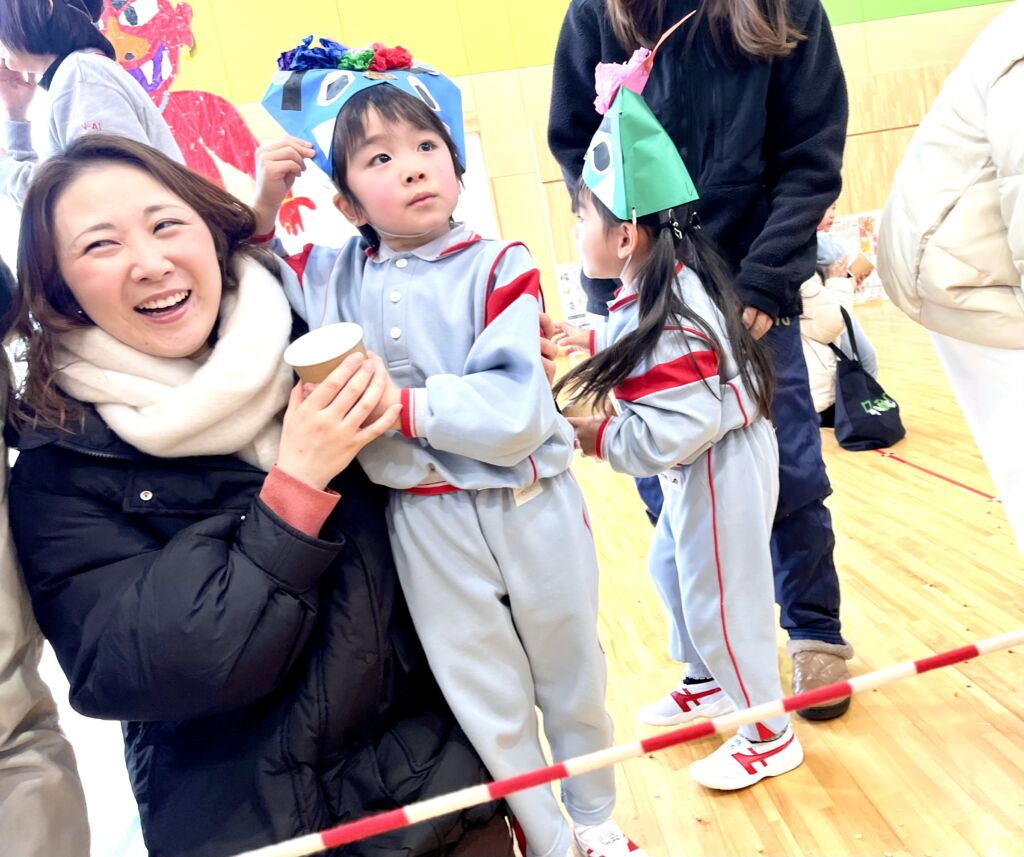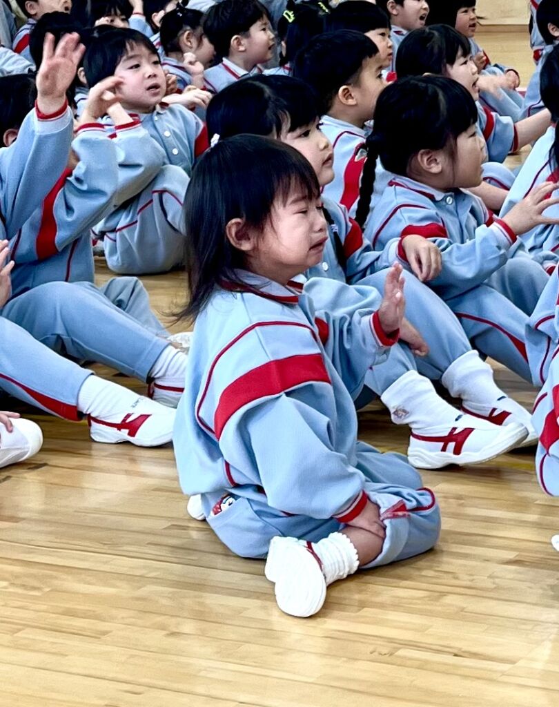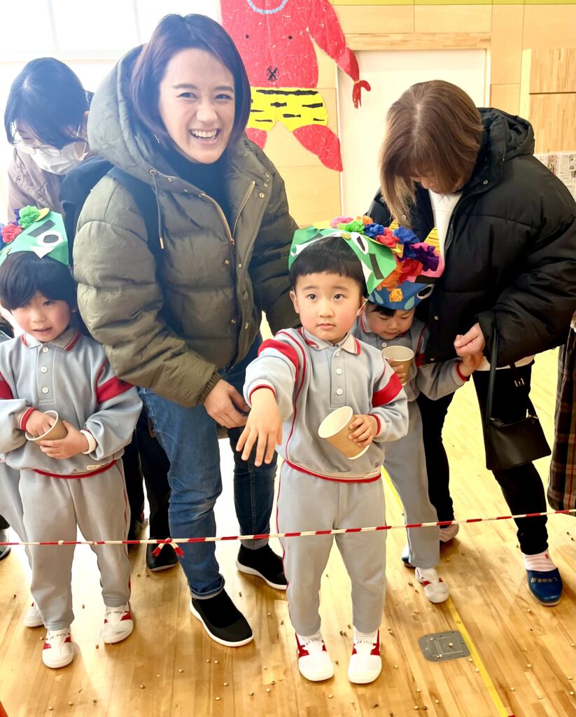 いつも傍らにいてくれる大好きな先生がステージの上に・・・。それも怖い鬼に追いかけられている。人生初の大ピンチのような豆まきのオープニングから、『鬼のパンツ』のダンスでは笑顔になって踊ることが出来ました。続く学年ごとの豆まきでは、年幼はおうちの人と一緒に力いっぱい豆をまき、年少も結界に守られ、動かない箱鬼と動かないパパ鬼たちを退治しました。