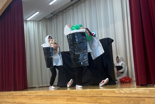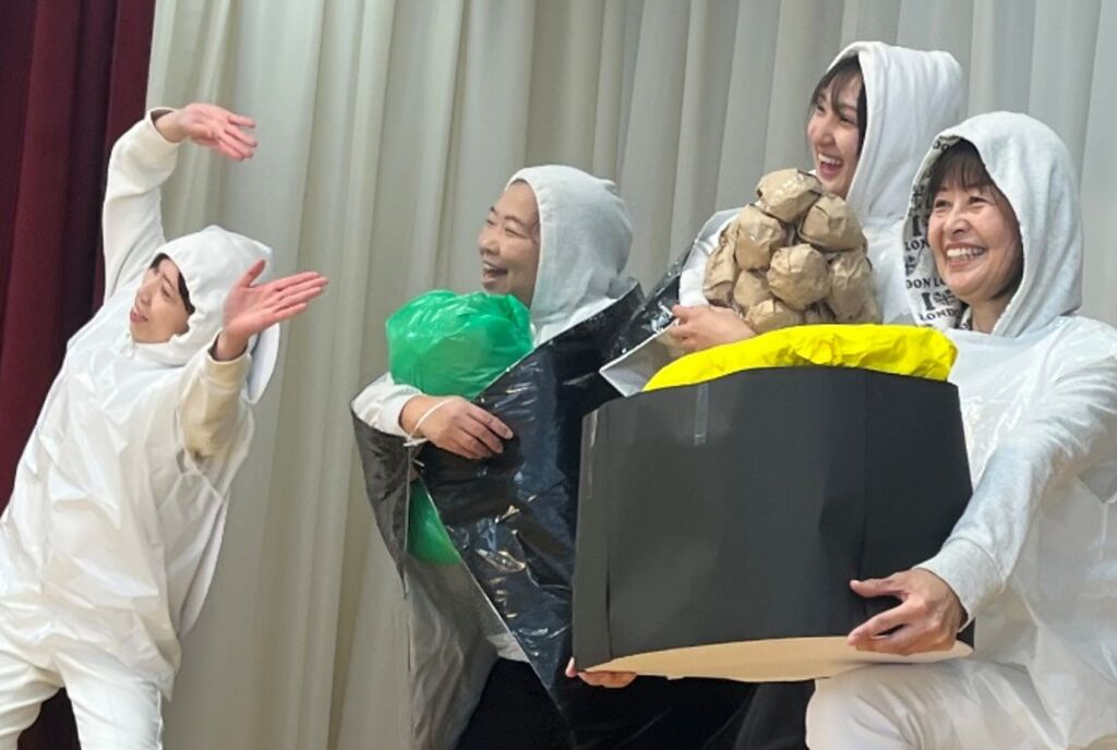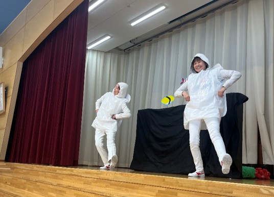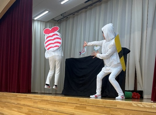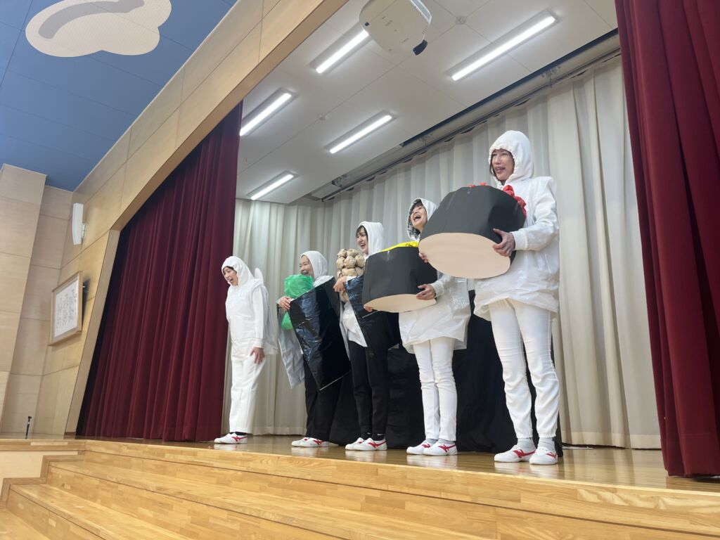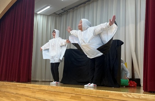 教師の劇は、『おすしのピクニック』。にぎり寿司、巻き寿司、ぐんかん巻の3組のネタが集まりピクニックに出かける楽しいダンスでした。先週のまめまきの会の体育館とは打って変わって、子ども達は、早い春のような優しいあたたかさに包まれました。
