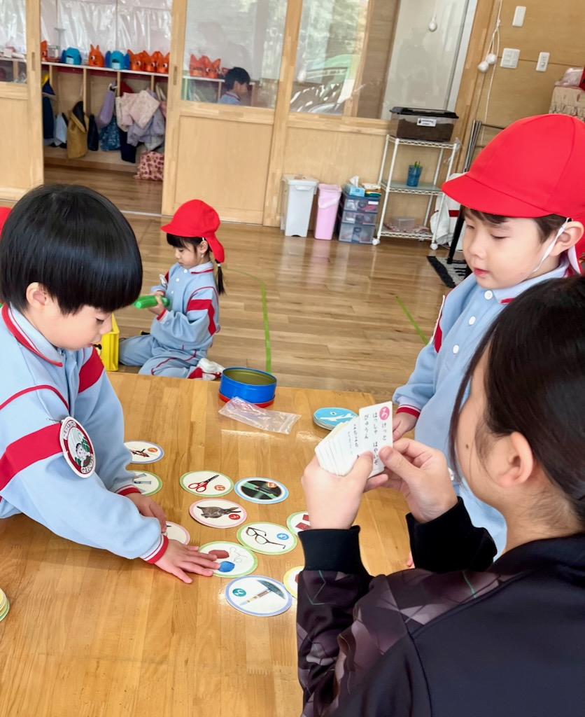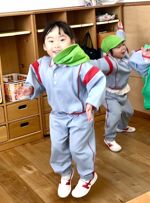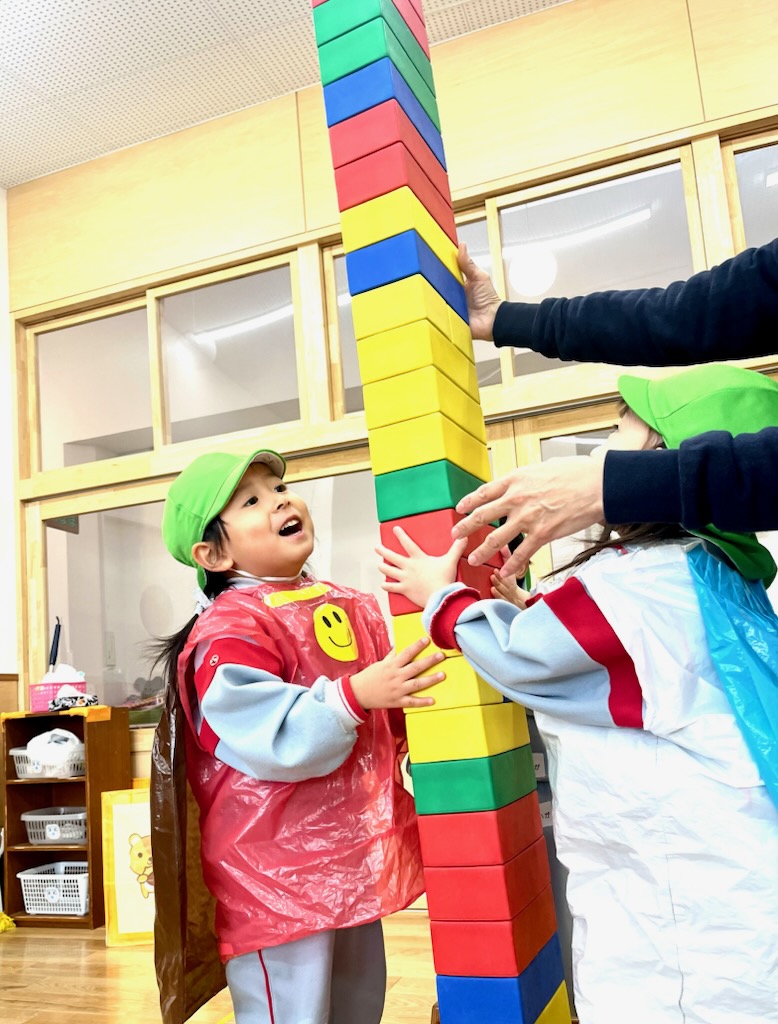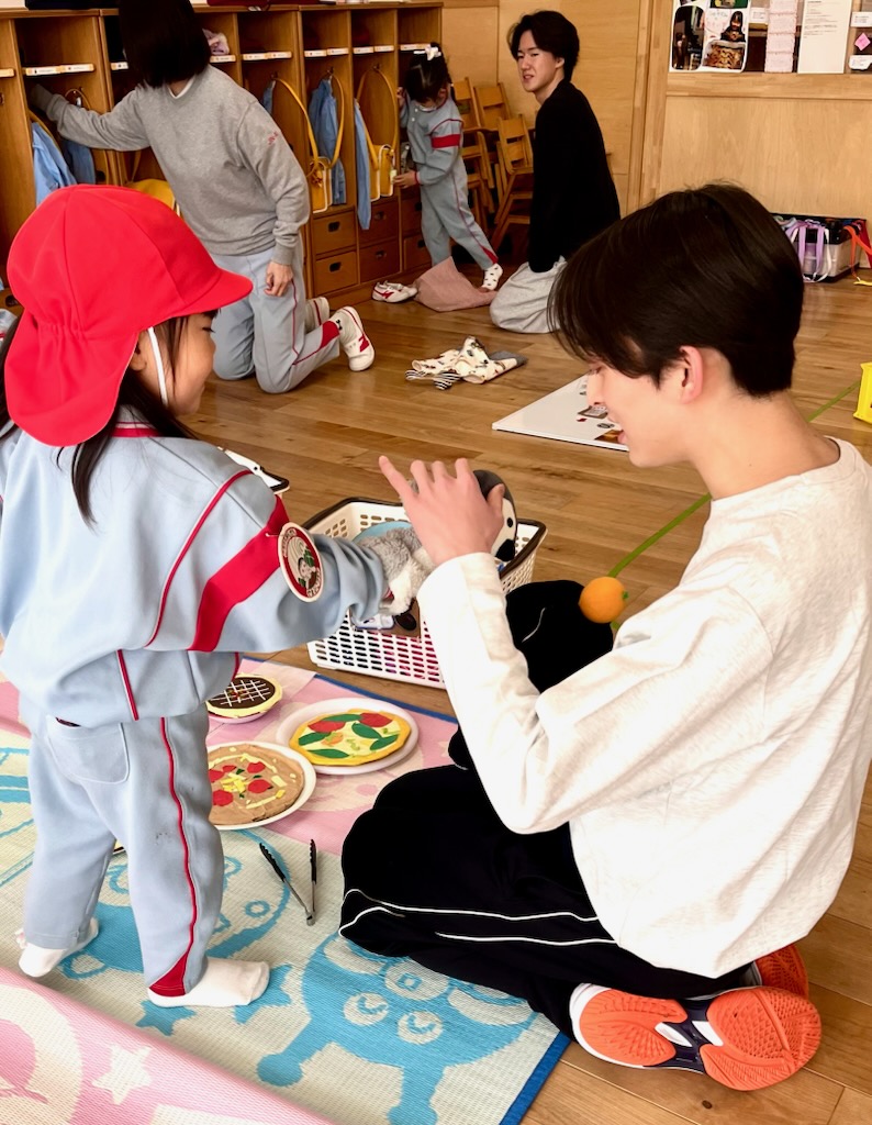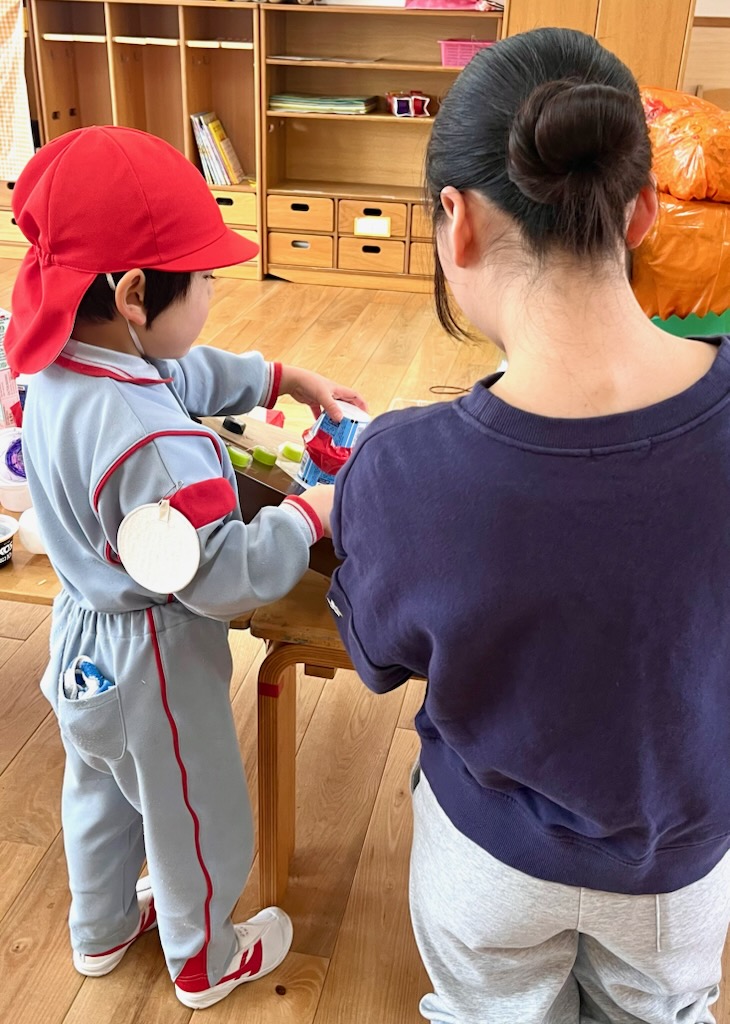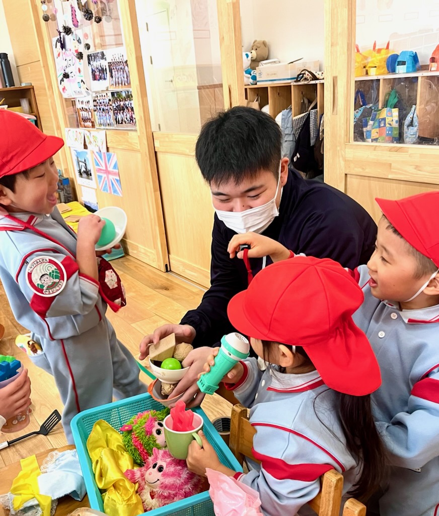 生活発表会が終わり、どの学年もぐんと成長して落ち着いた姿が見られた休み明けのスタートでした。ちょうど仁愛大学の保育実習初日となり、子ども達はテンション高く遊び始めました。実習生に慣れている子ども達です。玄関で「今日から実習生のお兄さん、お姉さん来てるよ。」の一言で、速足で部屋に向かう子どもが何人もいました。自由遊びの時間に部屋を周ると、すっかり仲よく?なって一緒に遊び込む子供たちがいました。天気だったので年長は今季初?園庭にでていました。
