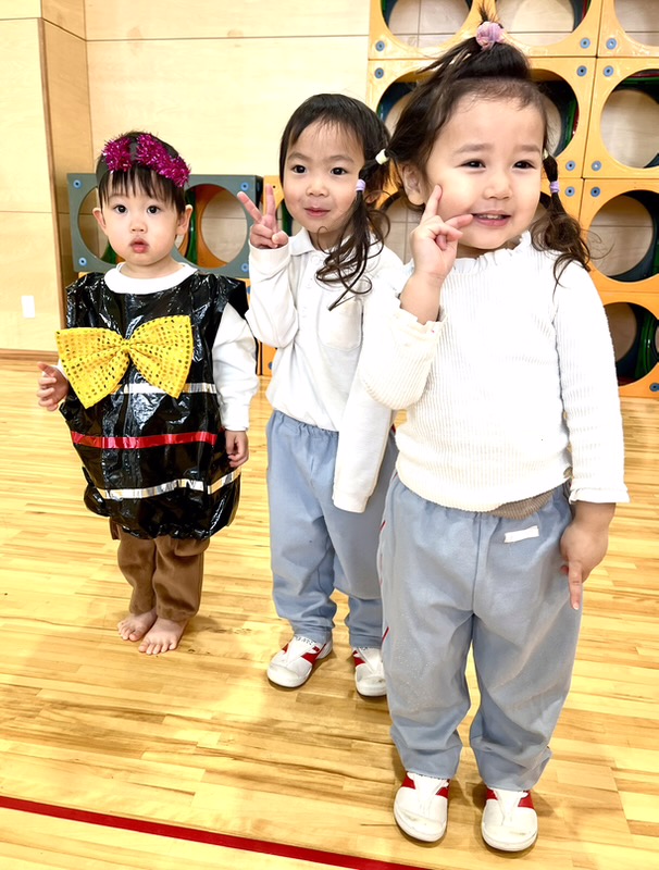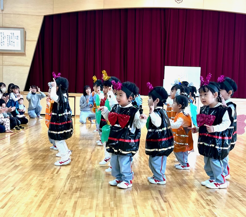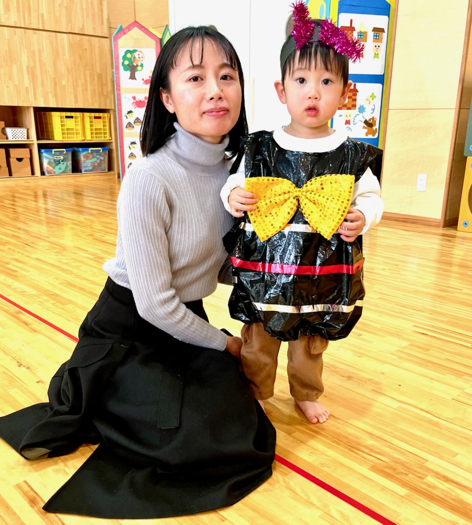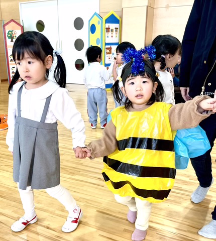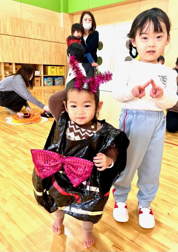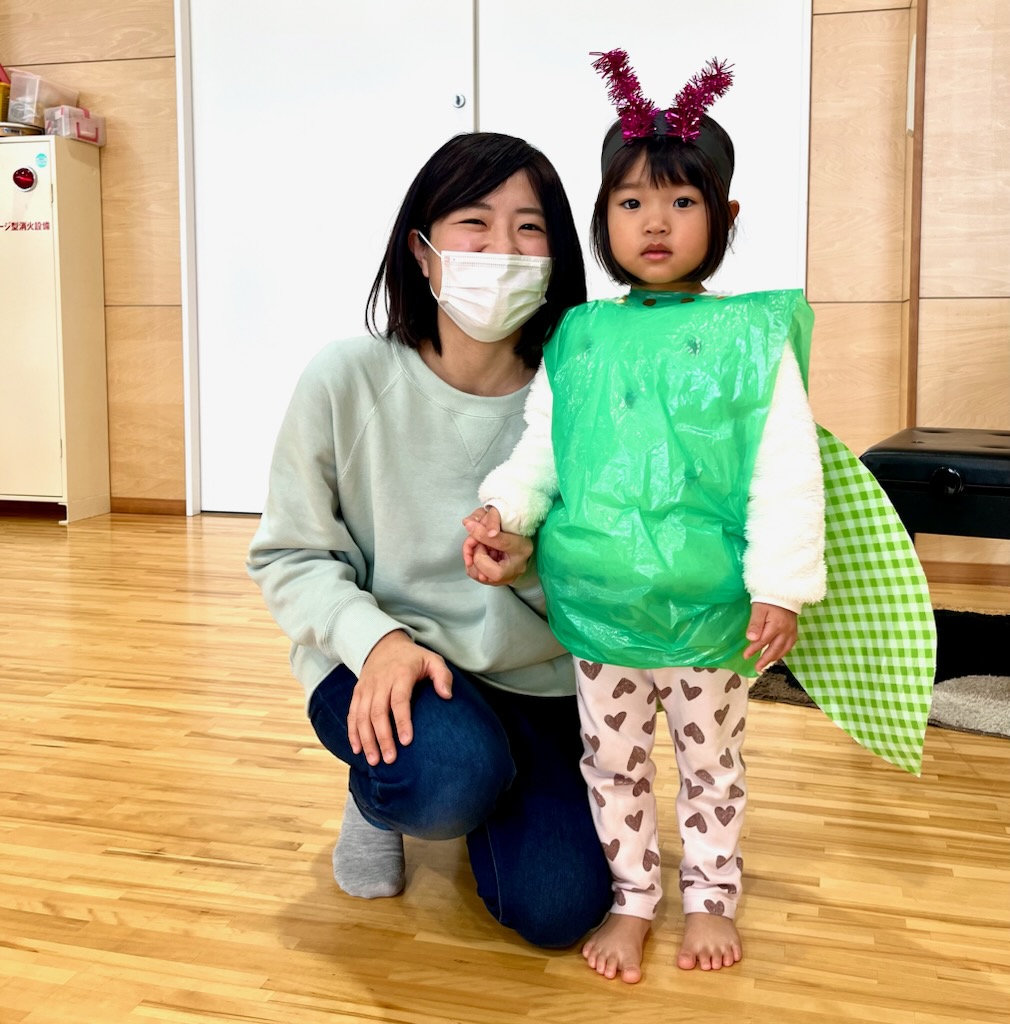 ちびクラ2日目も、年幼児の生活発表会のステージを見てもらいました。1日目よりも年齢が近く、昨年2日目のちびクラの中にはいってこのステージを見ていた園児が何人もいました。親御さんの中には、来年の我が子の姿をイメージしていただく機会となりました。発表を見た後は、ステージ衣装の試着でした。かわいい虫さんが次々と誕生しました。