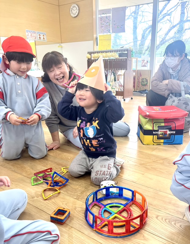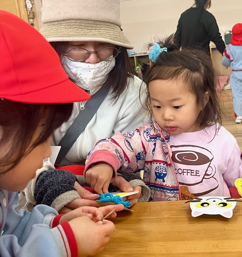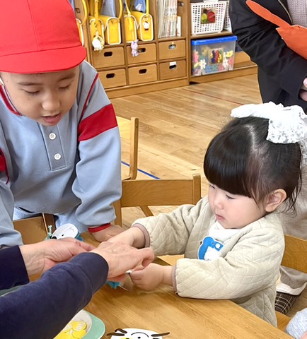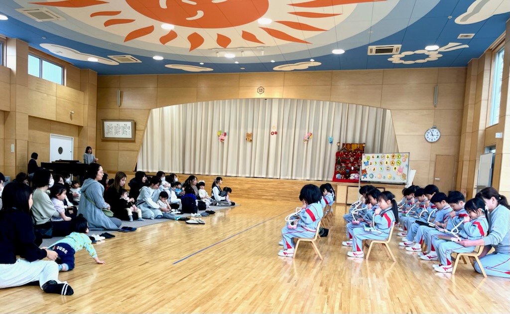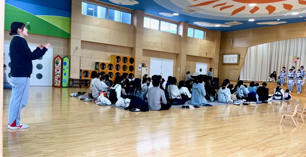 26日(木)は新入園児一日入園でした。年幼から年少、年中、年長へと部屋ごとに年齢に合わせた活動で新入園児をお迎えしました。親子で一緒に活動を楽しみながら、それぞれの年齢の子ども達と一緒に活動し、お子さんの育ちの見通しをもっていただく一助としました。また、クラスでの活動の後は、体育館で子ども達は気持ちを切り替え、学年全員で年中は鍵盤ハーモニカ、年長はリズムダンス、歌を聞いて頂き、お子さんの3年、4年先の育ちを想像していただきました。