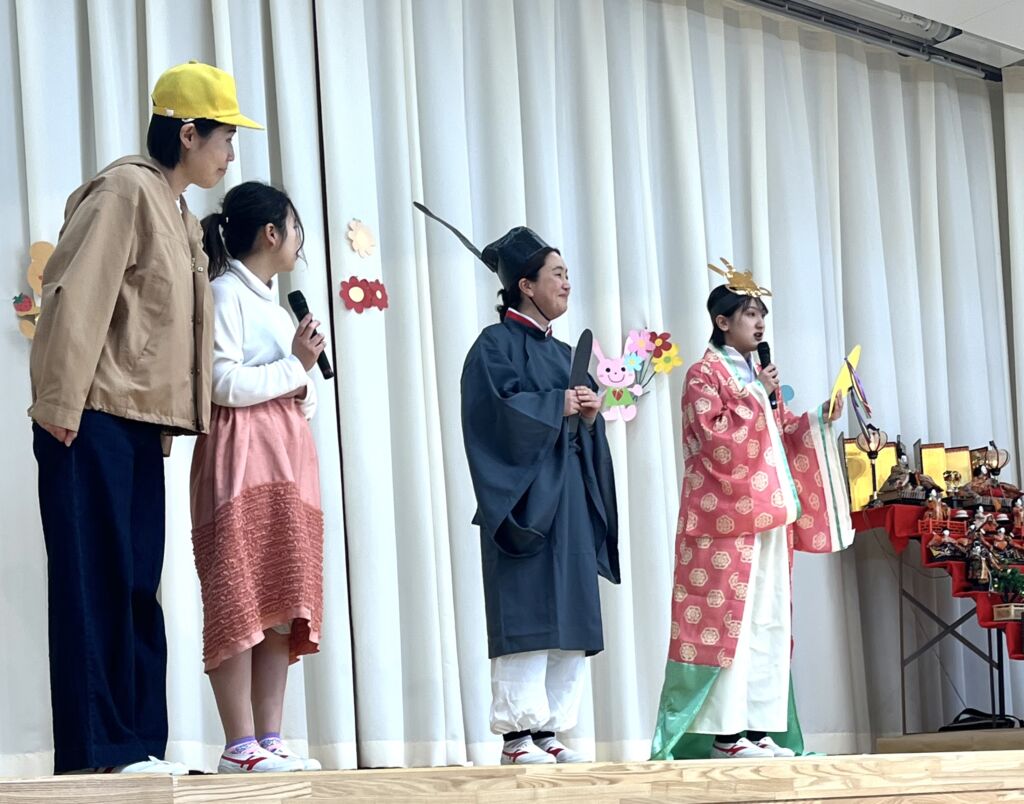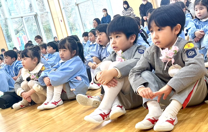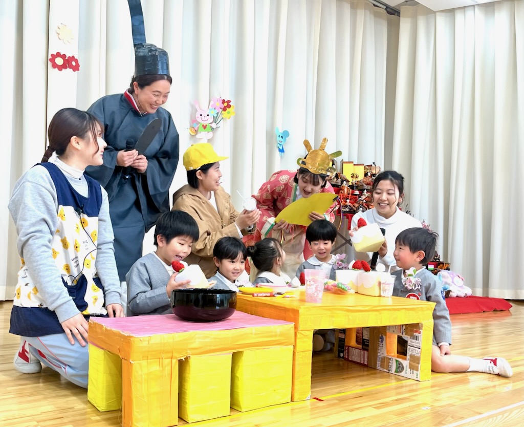 3月の誕生会はひな祭りとの同時開催でした。教師の出し物はお雛様とお内裏様の劇。雛飾りの歴史やひし餅のいわれなどを分かりやすく、劇の中で紹介してもらいました。最後はステージに誕生児もあがって、誕生パーティーに参加しました。