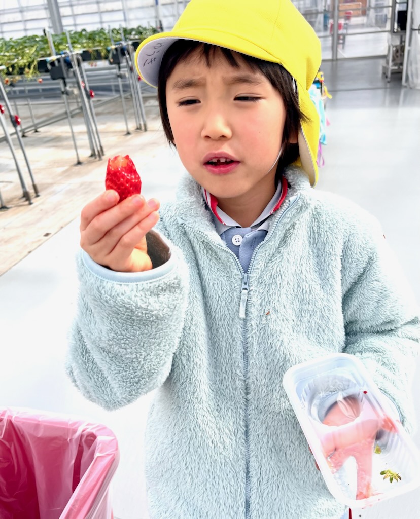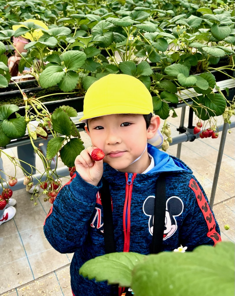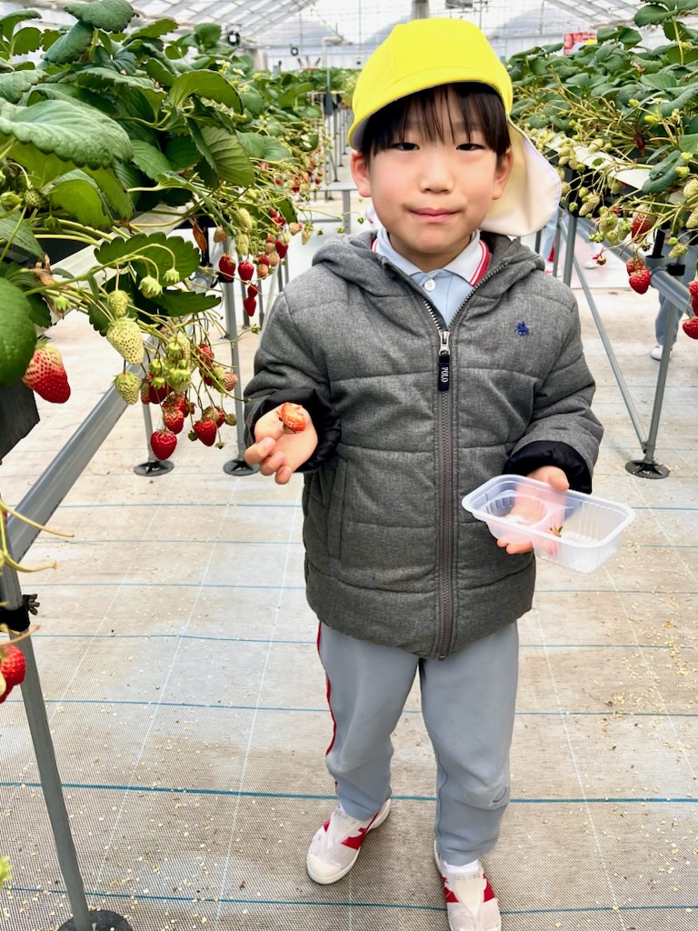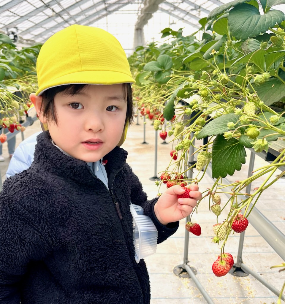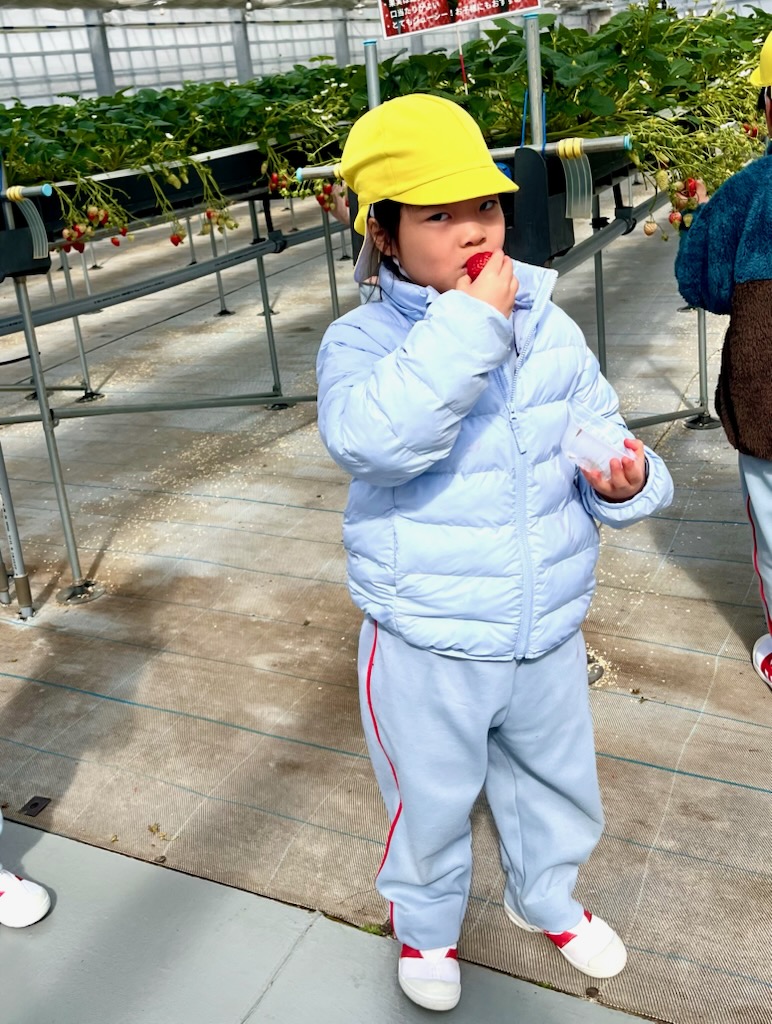 年長のお別れ遠足は、、坂井市のICHIGOOJIへ。学年当初からの計画でした。あいにく北風の強い寒い日でしたが、苺摘み取りのできるハウス内は春のような陽気で、苺の甘いにおいがうっすらと漂う空間でした。広い広い体育館の倍5以上はあるハウス内で、園児だけが自由に摘みとる体験とあって、安全面も安心で、子ども達は大きな苺を見つけては歓声を上げ、そして、そこで即実食という貴重な体験でした。後半になると、指先が真っ赤に染まる子や、ジャンパーの胸元が赤く染まる子など、満喫しているようするが伝わってきました。仲良しのお友達と集まって、苺パーティーを楽しむ子も。昼食時には、おなかがいっぱいで、持って行ったおやつが食べられなかった(お母さん報告)という子もでてきました。帰ってきたバスを迎えた教員は、バスを降りる子ども達からは、苺の香りが漂ってきました・・・・と。身体の中は苺でしたから。
