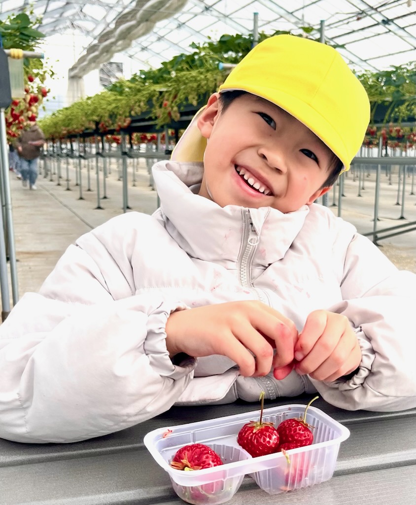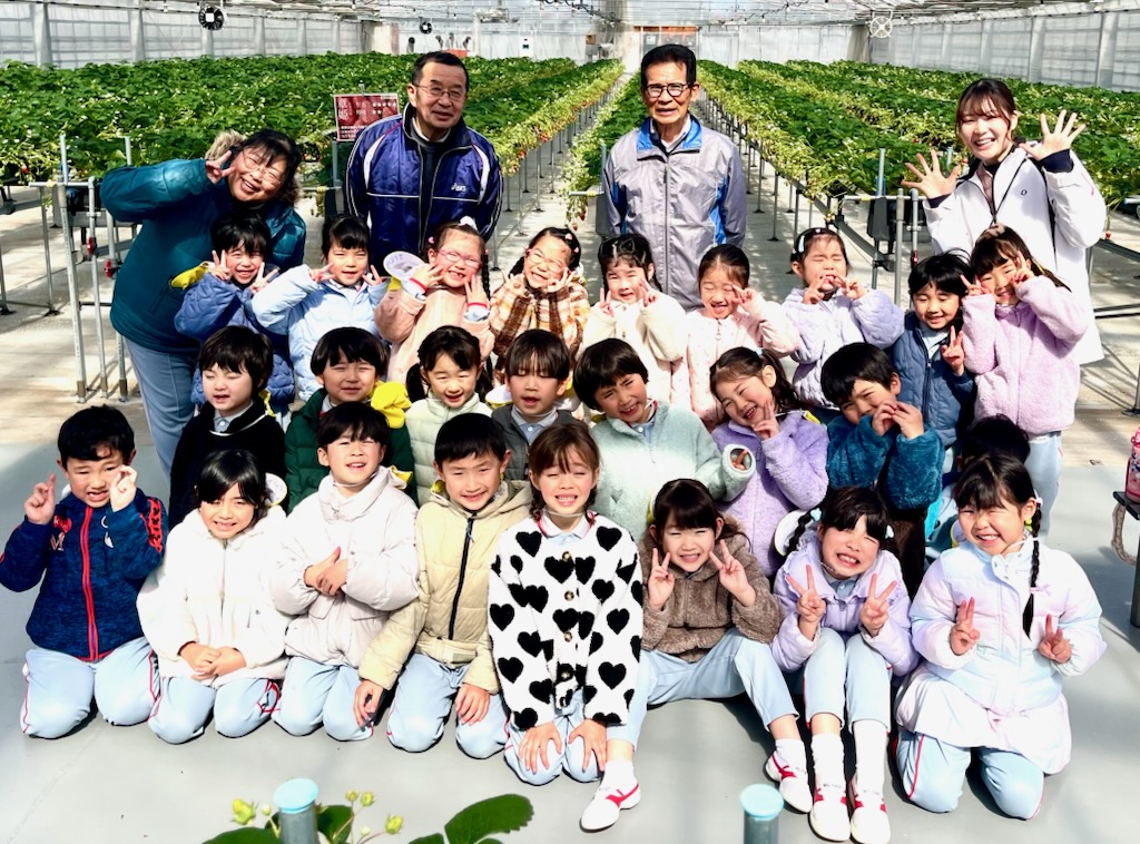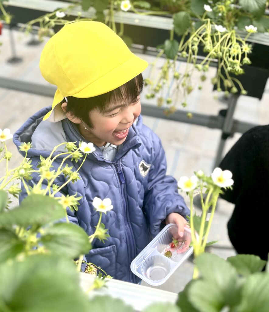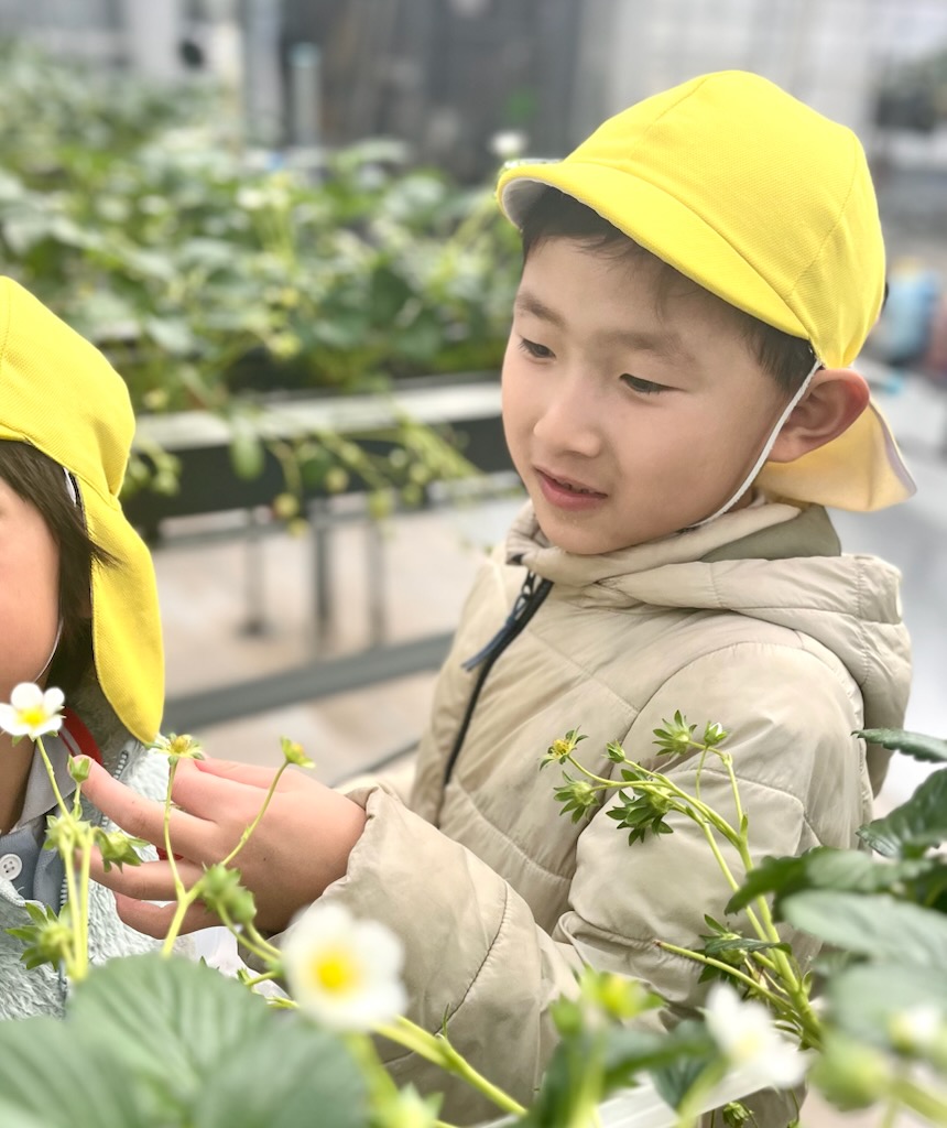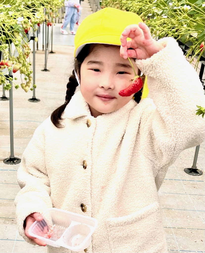 年長のお別れ遠足は、、坂井市のICHIGOOJIへ。学年当初からの計画でした。あいにく北風の強い寒い日でしたが、苺摘み取りのできるハウス内は春のような陽気で、苺の甘いにおいがうっすらと漂う空間でした。広い広い体育館の倍5以上はあるハウス内で、園児だけが自由に摘みとる体験とあって、安全面も安心で、子ども達は大きな苺を見つけては歓声を上げ、そして、そこで即実食という貴重な体験でした。後半になると、指先が真っ赤に染まる子や、ジャンパーの胸元が赤く染まる子など、満喫しているようするが伝わってきました。仲良しのお友達と集まって、苺パーティーを楽しむ子も。昼食時には、おなかがいっぱいで、持って行ったおやつが食べられなかった(お母さん報告)という子もでてきました。帰ってきたバスを迎えた教員は、バスを降りる子ども達からは、苺の香りが漂ってきました・・・・と。身体の中は苺でしたから。