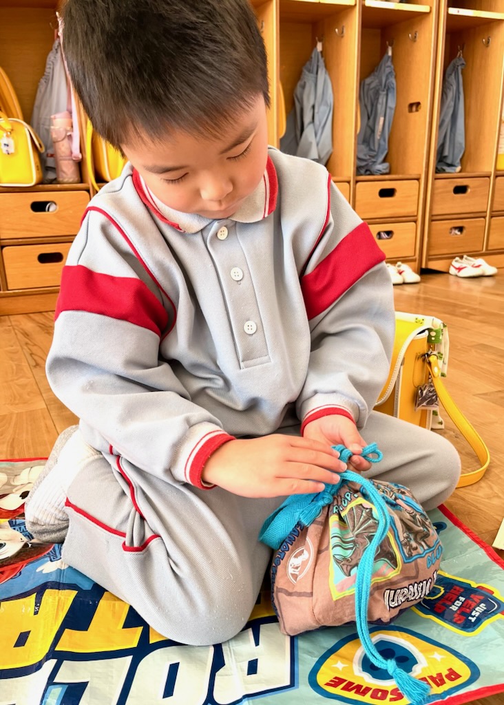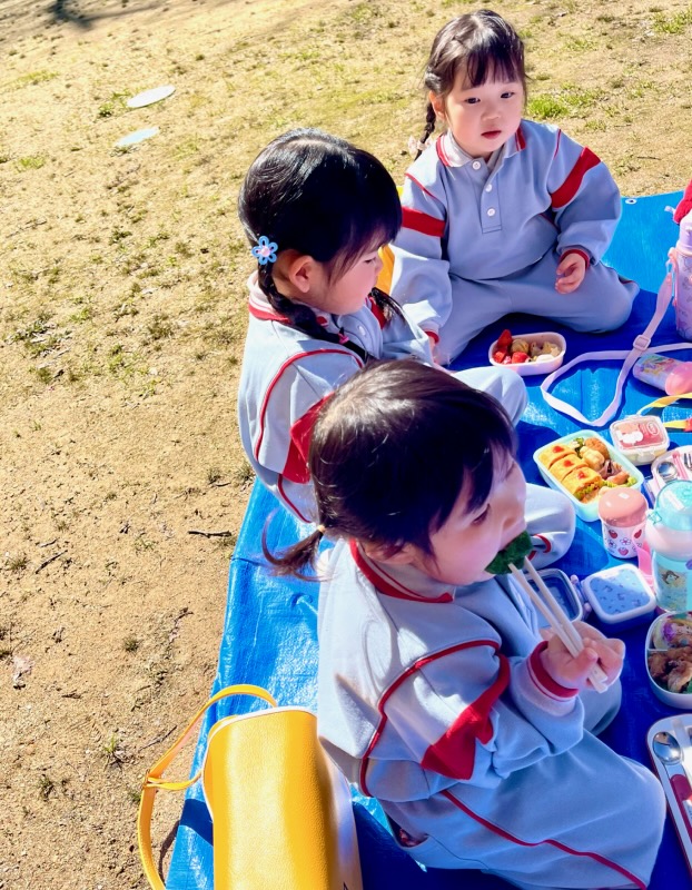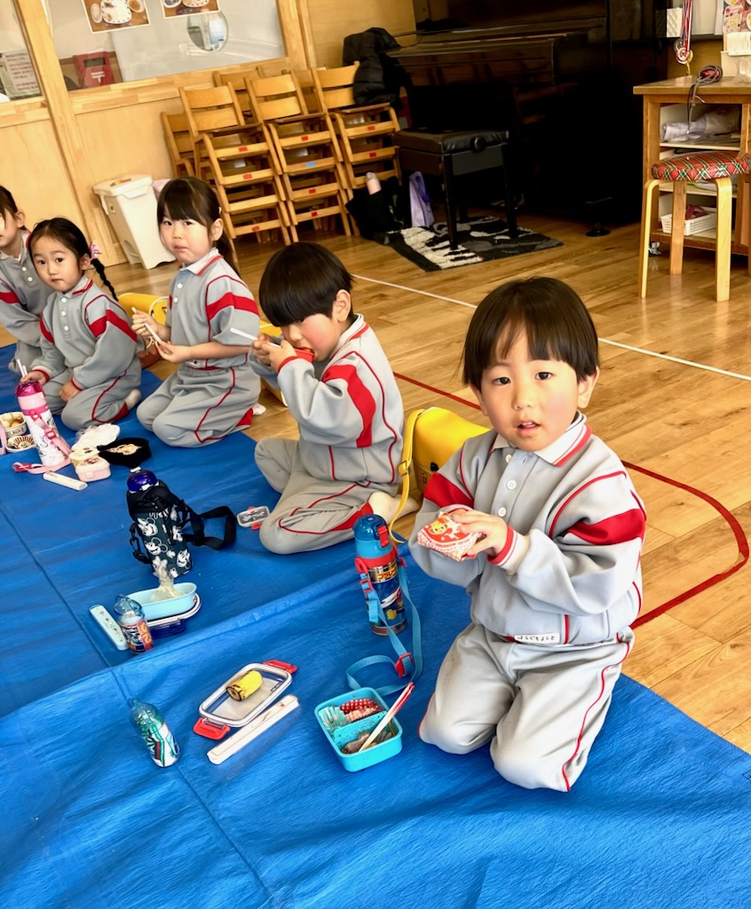 お昼は、今年最後のお弁当。お天気が良かったのですが、風邪が冷たかったので、クラスの子ども達の体調によって、部屋とテラスで食べるクラスに分かれましたが、どちらも楽しい時間でした。