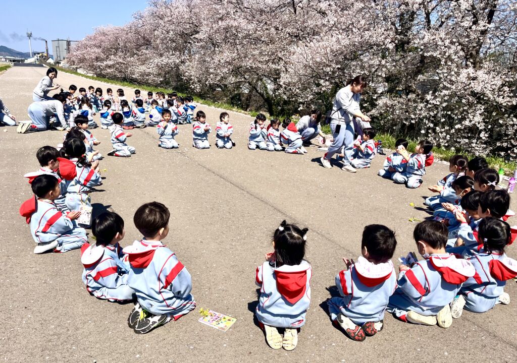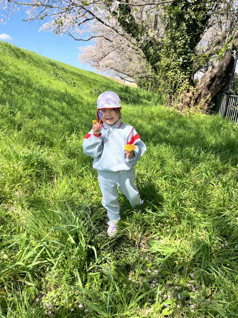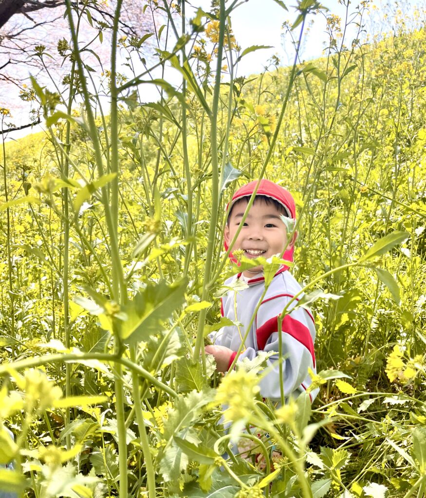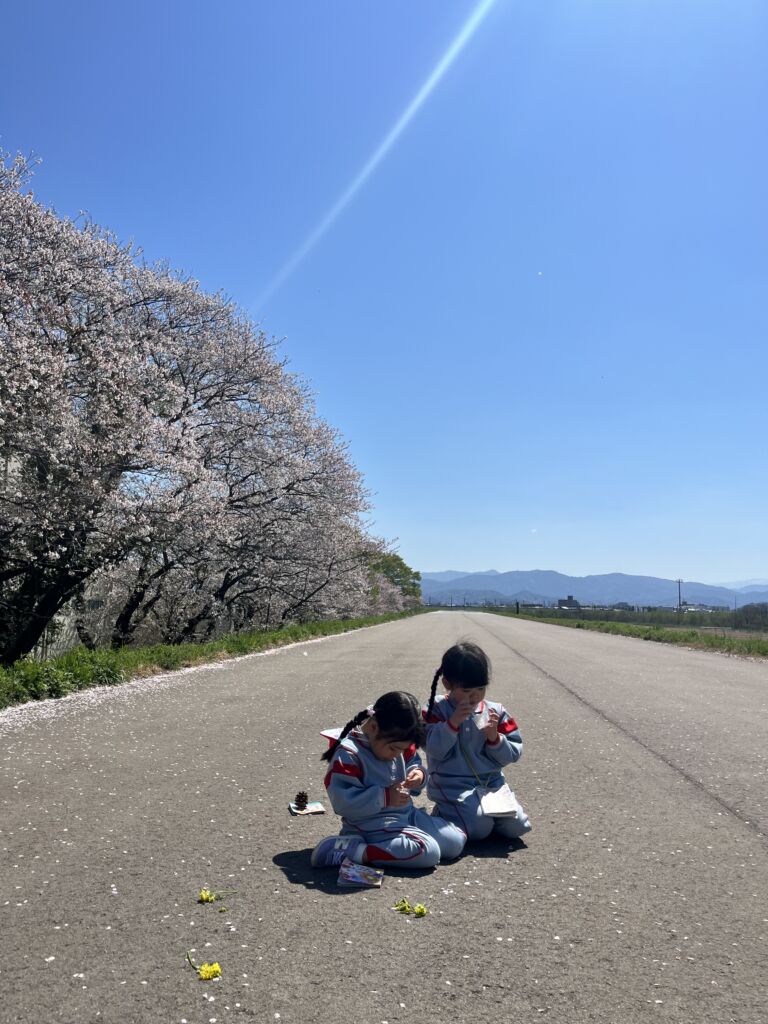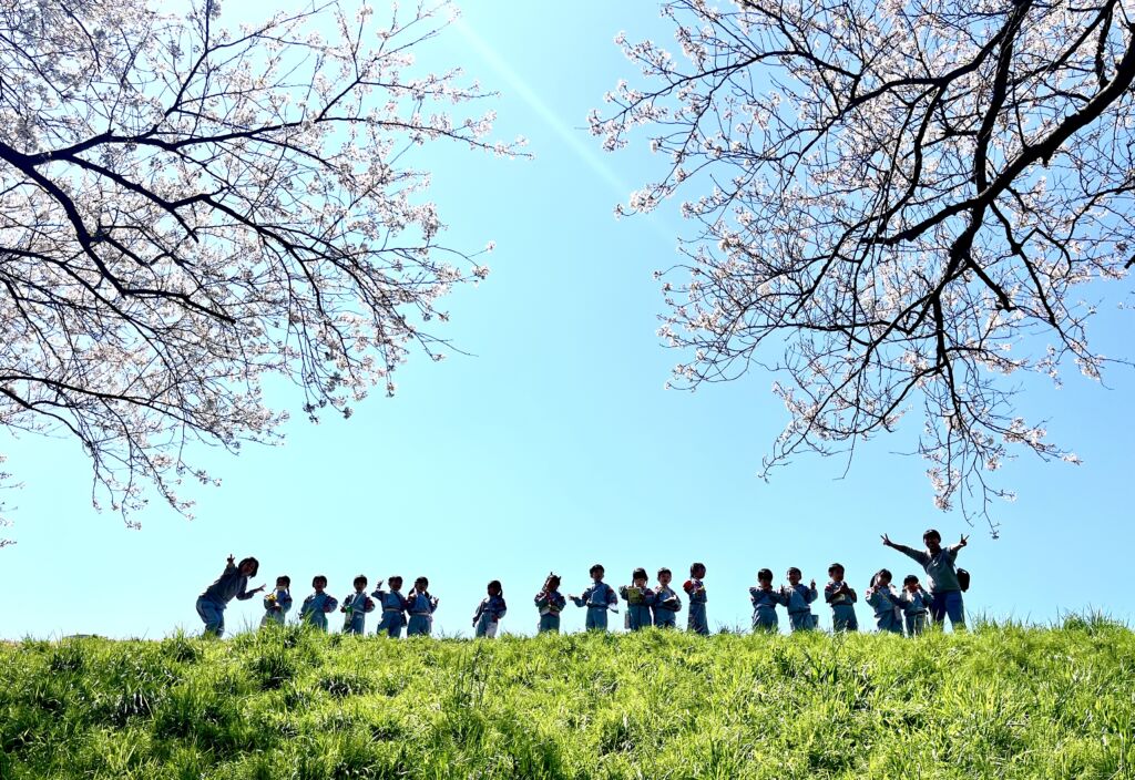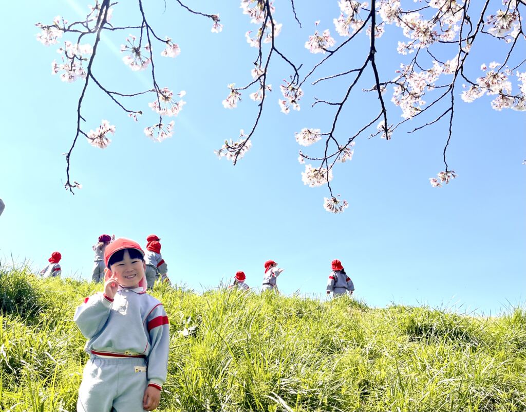 柔らかな春の日差しの中、園庭の桜の花びらが風に舞、正面玄関まで飛んできました。年幼の泣き声も日一日と短く、そして小さくなっていくようです。9日の木曜日には翌日からの天候の崩れを予想して、年中と年長が堤防にあがっての花見を楽しみ、河川敷で花摘みなどの春を全身で楽しみました。柔らかな緑と、菜の花の黄色。青い空のコントラストは日本の春そのものでした。子ども達の原風景として残っていって欲しいものです。