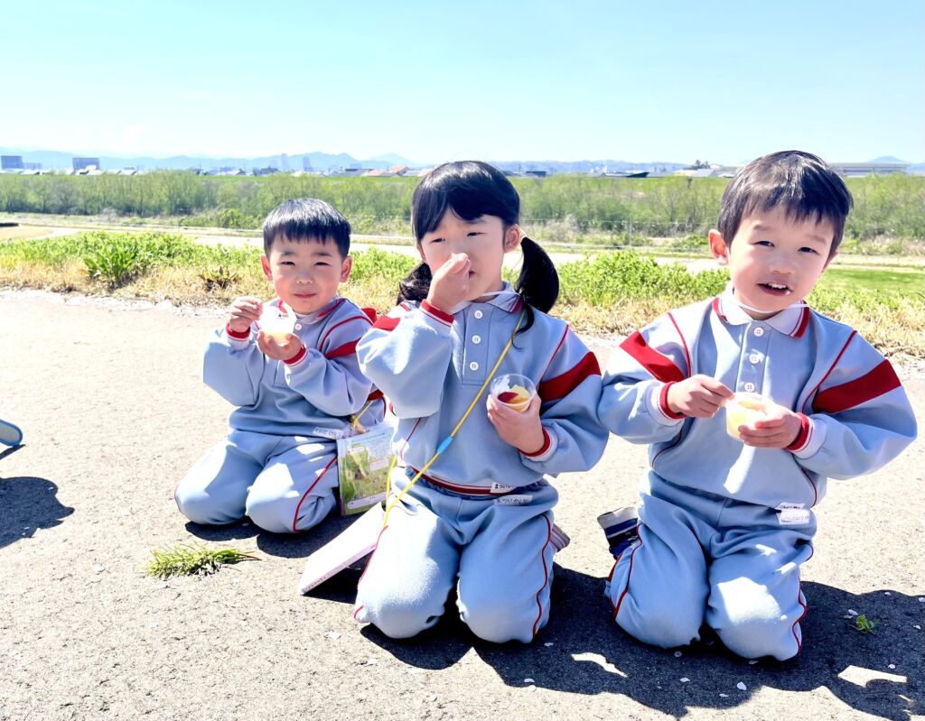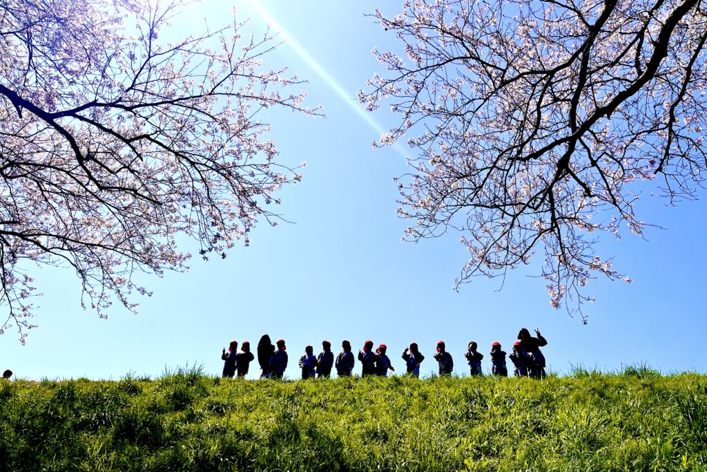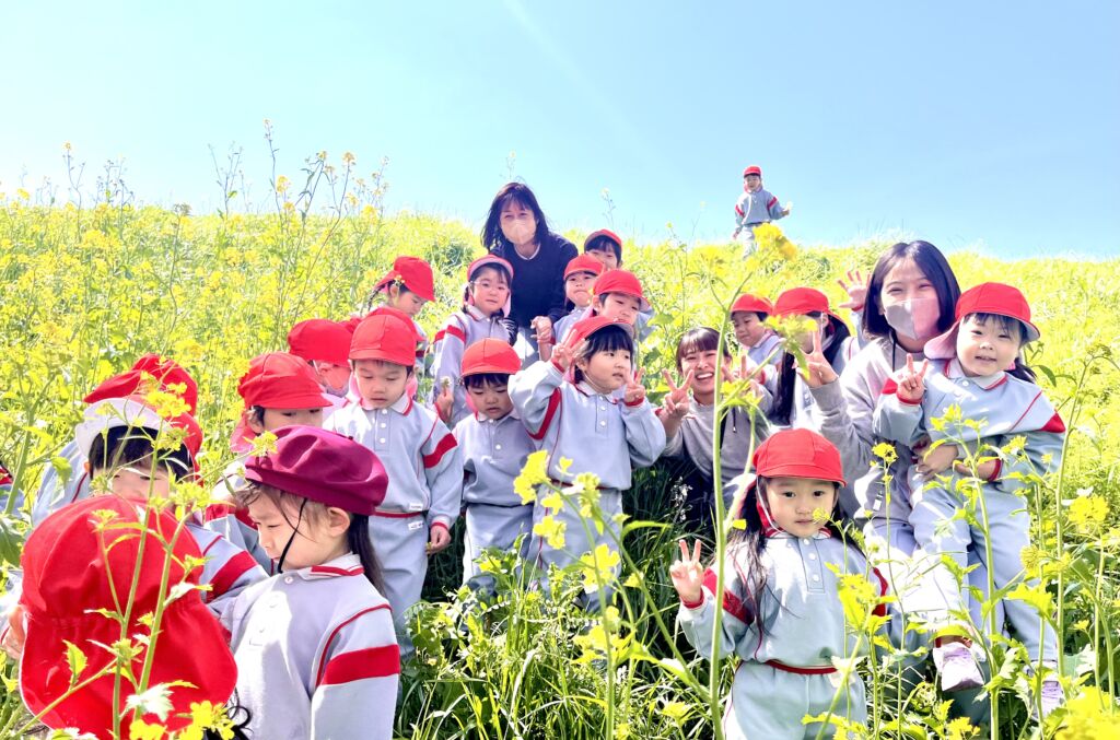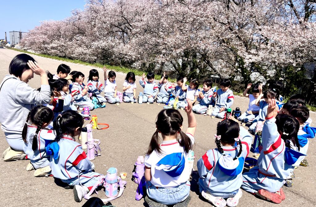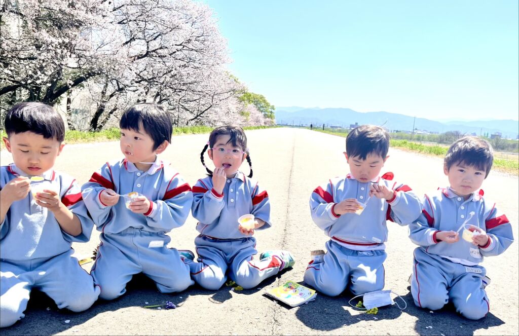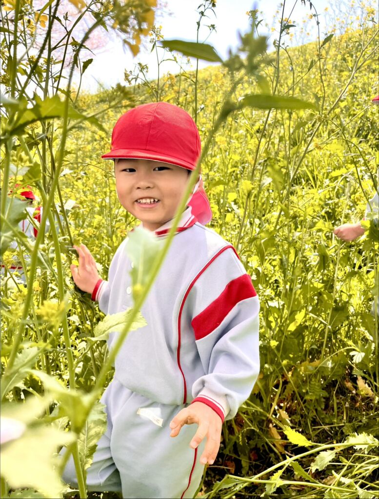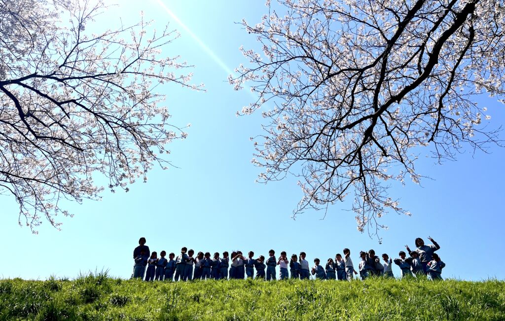 柔らかな春の日差しの中、園庭の桜の花びらが風に舞、正面玄関まで飛んできました。年幼の泣き声も日一日と短く、そして小さくなっていくようです。9日の木曜日には翌日からの天候の崩れを予想して、年中と年長が堤防にあがっての花見を楽しみ、河川敷で花摘みなどの春を全身で楽しみました。柔らかな緑と、菜の花の黄色。青い空のコントラストは日本の春そのものでした。子ども達の原風景として残っていって欲しいものです。