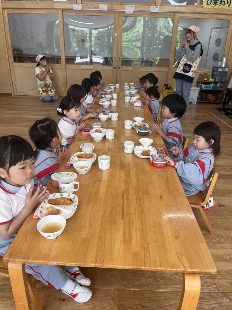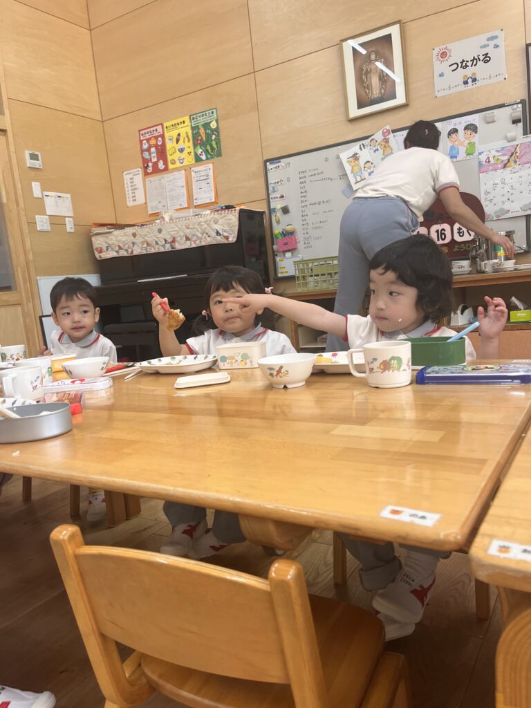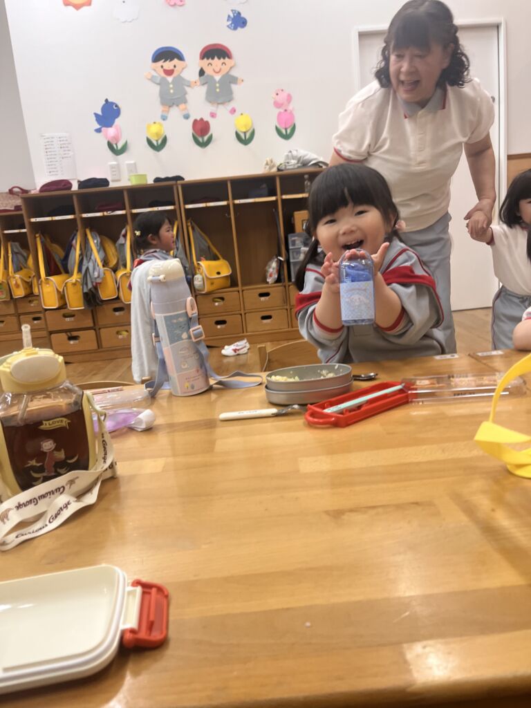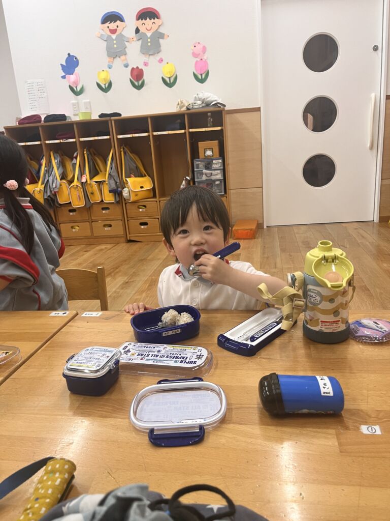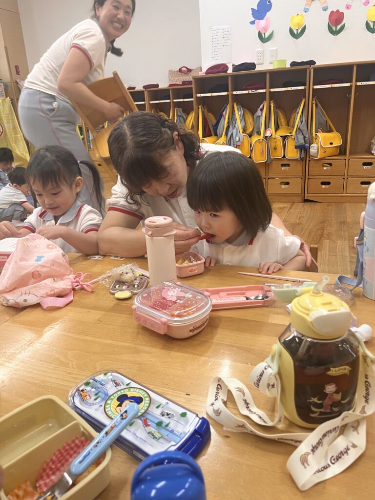 水曜は年幼にとっては初めてのお弁当の日。それぞれのお弁当、量も、食べる速さも、食べ方も一人ひとり別々。先生が瞬間移動⁉でサポートしていました。