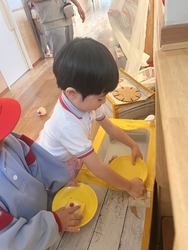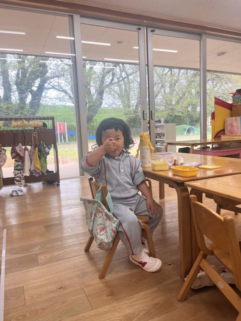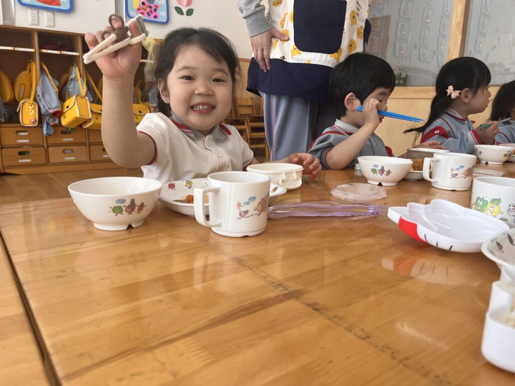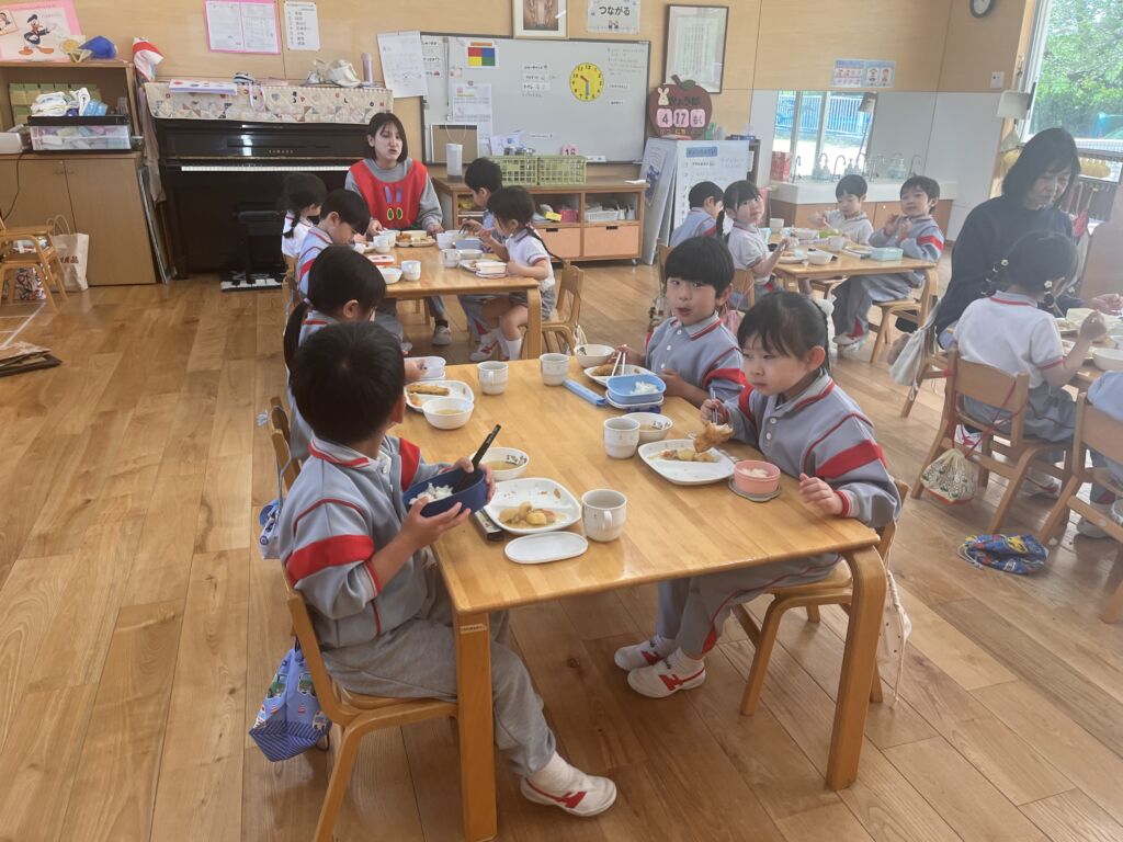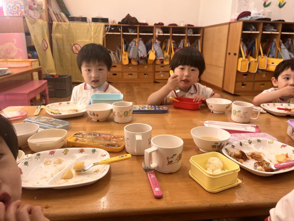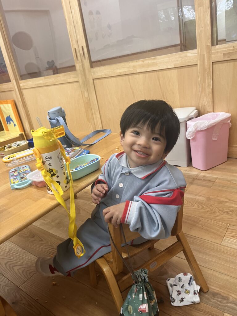 水曜は年幼にとっては初めてのお弁当の日。それぞれのお弁当、量も、食べる速さも、食べ方も一人ひとり別々。先生が瞬間移動⁉でサポートしていました。