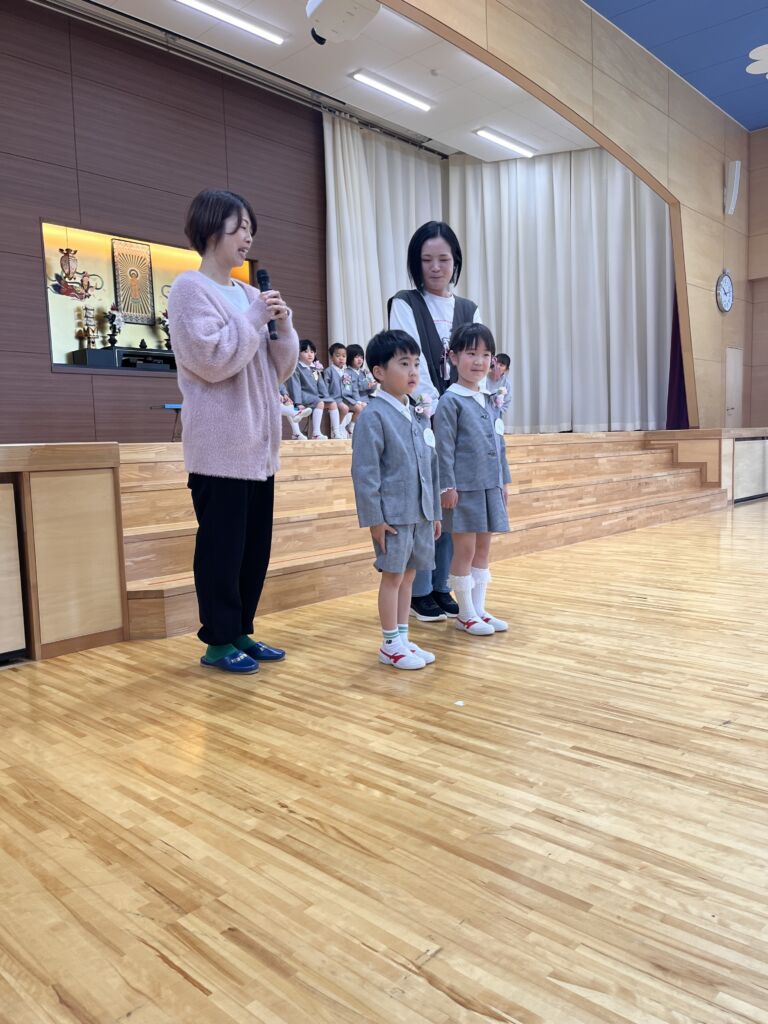 4月の誕生会から始まった第2週は、日を増すごとに園舎内が落ち着いてくるのがわかりました。あれだけ大泣きをしていた年幼児が笑顔で園舎内に入っていくのを見守る親御さんの方が悲しそうなのも毎年の風景です。第2週の始まりの誕生会では、年長誕生児のお母さんに、名前に込めた思いをみんなの前で紹介をしてもらいました。園長からは、「つけてもらえた名前の子になれるようにがんばりましょう。」と話をしました。