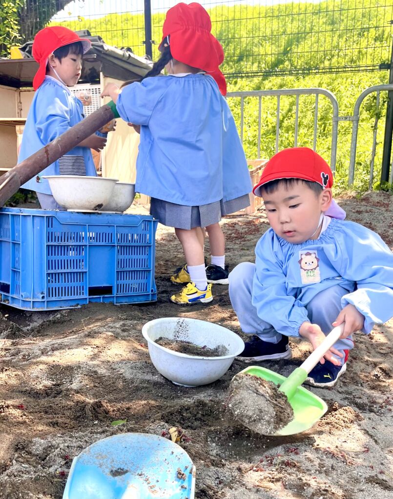 月曜日は交通安全の日。バスの乗り方、降り方、駐車場からの歩き方などを職員の劇から学びました。外遊びには絶好のお天気。園庭では、カラーキャップが入り混じって遊ぶ様子が見られました。