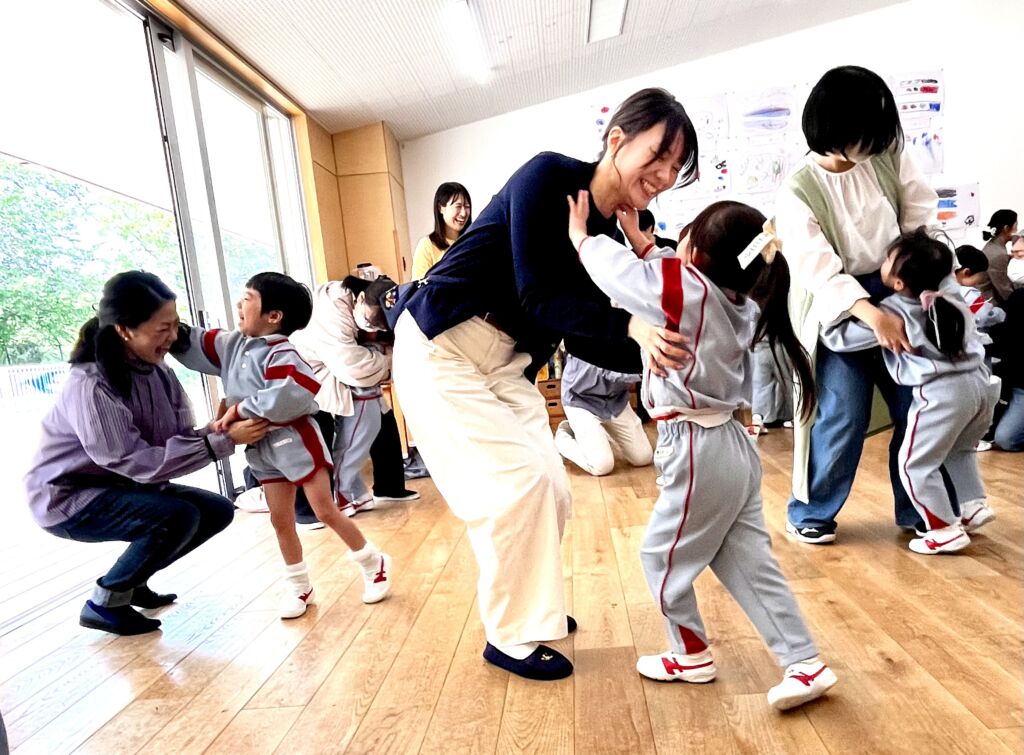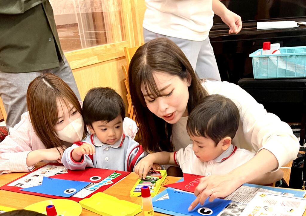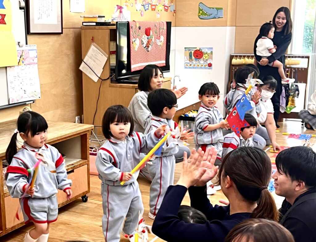 25日(土)は、年度始めての保育参観でした。自由遊びの時間の葉桜の園庭は、親子で遊ぶ子供たちの歓声が響き渡りました。クラス毎の活動では、各部屋でふれあい遊びや製作など、親子で「一緒」に楽しい時間を過ごしました。